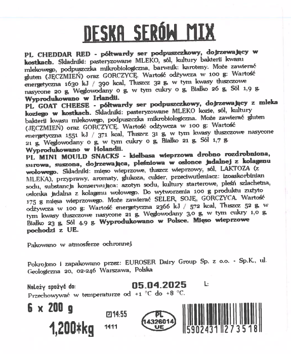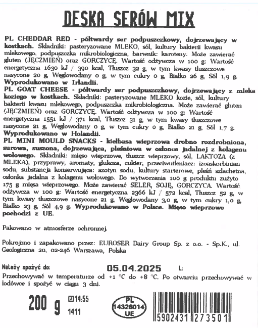| Składniki | Cheddar red cubes: pasteryzowane mleko, sól, kultury bakterii kwasu mlekowego, podpuszczka mikrobiologiczna, barwnik: karoteny. goat cheese cubes: pasteryzowane mleko kozie, sól, kultury bakterii kwasu mlekowego, podpuszczka mikrobiologiczna. mini mould salami: mięso wieprzowe, tłuszcz wieprzowy, sól, laktoza (z mleka) , przyprawy, aromaty, glukoza, cukier, przeciwutleniacz: izoaskorbinian sodu, substancja konserwująca: azotyn sodu, kultury starterowe, pleśń szlachetna, osłonka jadalna z kolagenu wołowego. do wytworzenia 100 g produktu zużyto 175 g mięsa wieprzowego. |