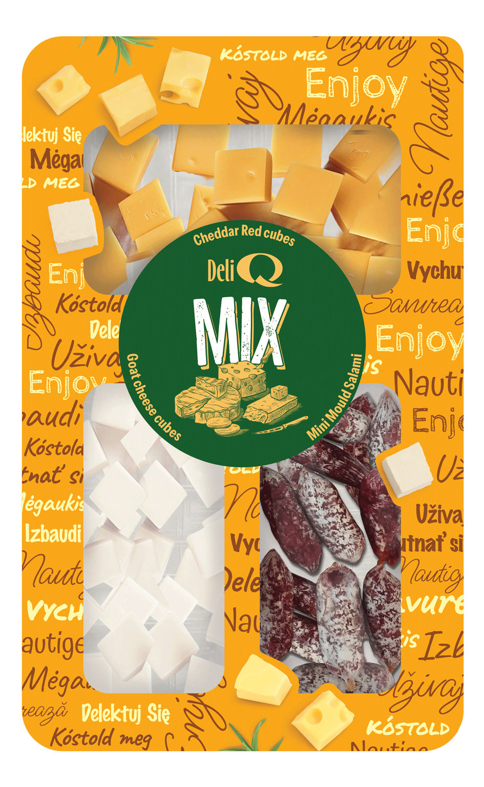 DELI Q MIX to doskonałe połączenie dwóch wyjątkowych serów w formie małych kostek z mini salami pleśniowym. To nie tylko pyszna przekąska, ale także doskonała propozycja na spotkania towarzyskie. DELI Q MIX to prawdziwe doświadczenie kulinarnego luksusu, które podkreśli Twoją pasję do wyrafinowanego smaku.