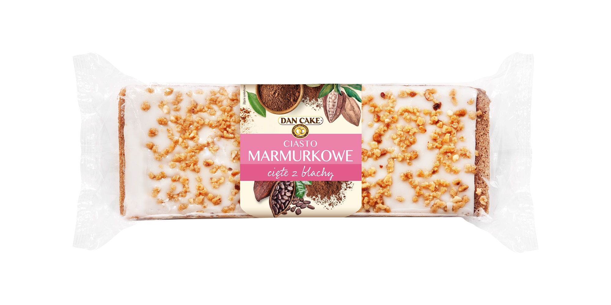 Cięte z blachy, waniliowo-kakaowe ciasto dekorowane lukrem i kruszonymi orzechami laskowymi.