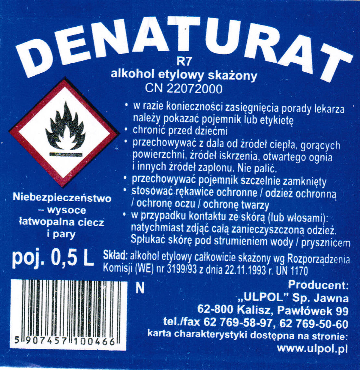 Denaturat to alkohol etylowy całkowicie skażony. Substancje skażające nadają denaturatowi specyficzny zapach. Jest stosowany jako środek m.in. do dezynfekcji, odtłuszczania i mycia.