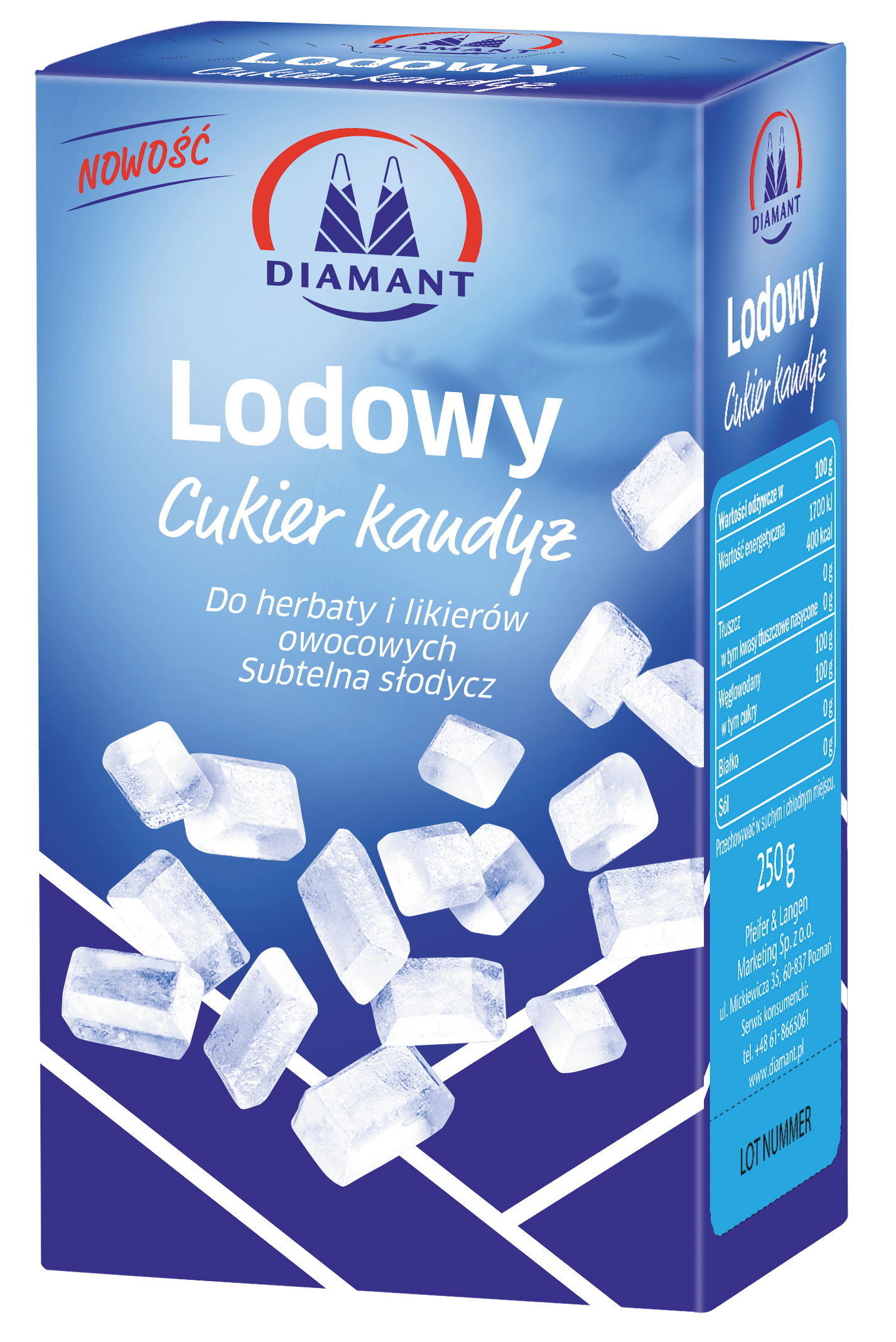 Cukier trzcinowy DIAMANT Dry Demerara drobny segregowany cukier o specjalnie drobnej granulacji, który szybko się rozpuszcza. Dzięki temu jest doskonały zarówno do słodzenia kawy, herbaty oraz drinków, jak również idealnie nadaje sie do pieczenia lekkich ciast, biszkoptów, kremów i bez. Pakowany jest w eleganckie kartoniki 500g. Na tylnej ściance opakowania znajduje sie przepis na interesujacy wypiek, a na frontowej wyciete okienka, przez które widac produkt. Poza tym w kartoniku umieszczone sa woreczki strunowe, ktorych wygodne i szczelne zamknięcie pozwala na łatwiejsze dozowanie cukru oraz chroni go przed wilgocią, zanieczyszczeniem i wysypywaniem się.