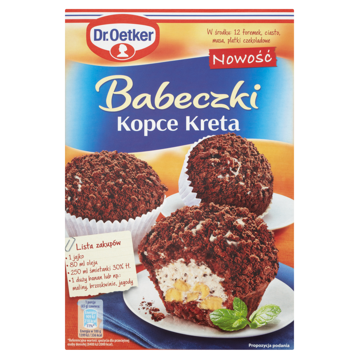 Lubisz Kopiec Kreta i chciałabyś robić go częściej? Jest na to sposób! Z nowymi Babeczkami Dr. Oetkera ulubione ciasta mogą pojawić się w Twoim domu w każdej chwili. Uproszczone przygotowanie, komplet niezbędnych składników i przyjazna instrukcja to tylko część zalet nowych babeczek. Opakowanie zawiera ciasto, masę, płatki czekolady i foremki.