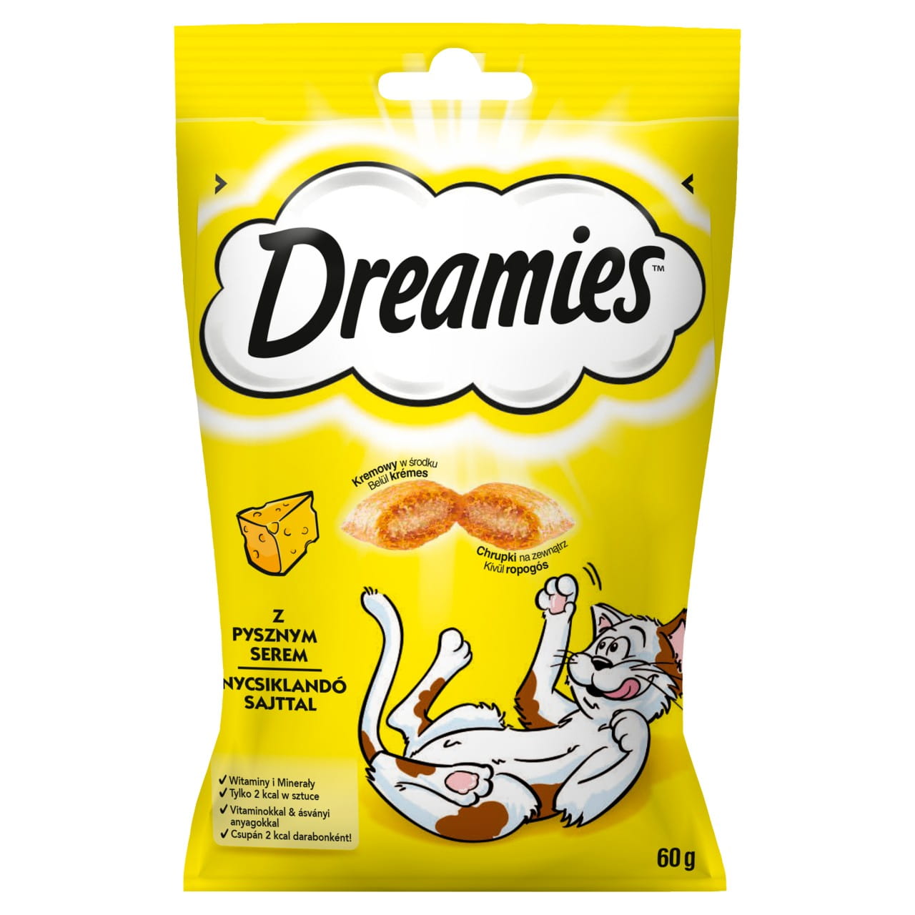 Koty szaleją za zniewalającym smakiem DREAMIES™. Pysznie chrupiące przysmaki DREAMIES™ z miękkim nadzieniem, o smaku sera, któremu koty po prostu nie potrafią się oprzeć. Więc śmiało, potrząśnij opakowaniem i patrz jak Twój kot przybiega na ucztę. 1. Dwie konsystencje w jednym, zniewalającym przysmaku dla kotów. 2. Przysmaki pysznie chrupiące na zewnątrz, miękkie w środku. 3. Ciasteczka dla kotów o smaku sera z witaminami i substancjami mineralnymi, bez sztucznych aromatów.