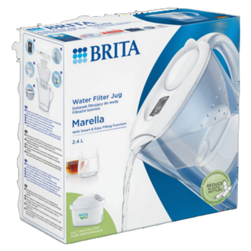 Wygodę użytkowania dzbanka Marella zapewniają następujące elementy: pokrywka z uchylną klapką wlewu wody, dzięki której można napełnić dzbanek bez konieczności zdejmowania pokrywki, profilowany uchwyt, elektroniczny wskaźnik wymiany wkładu (Memo), który automatycznie przypomina o konieczności wymiany wkładu filtrującego co 4 tygodnie oraz półprzeźroczysty lejek umożliwiający kontrolowanie tempa procesu filtracji. Dzbanek wyposażony jest w mechanizm PerfectFit zapewniający dokładne przefiltrowanie wody przy zastosowaniu oryginalnych wkładów BRITA. Dzbanek i lejek filtra można bezpiecznie myć w zmywarkach automatycznych. Pokrywkę należny umyć ręcznie, nie mocząc wskaźnika wymiany wkładów. Rozmiar dzbanka umożliwia na umieszczenie go na półce na drzwiach lodówki. W zestawie znajduje się jeden wkład filtrujący MAXTRA PRO Pure Performance.