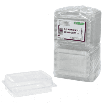 Przeźroczysty pojemnik z wysoką przykrywką mający wiele zastosowań, głównie do wszelkiego rodzaju żywności. Używany przede wszystkim do pakowania ciast, kruchych ciastek, pączków, faworków, rolad, tortów, lodów, ale także sałatek, i zimnej, gotowej żywności (makaronów, past, bigosów, pasztecików, naleśników, wyrobów garmażeryjnych a nawet grzybów). Stosowany także do wyrobów przemysłowych, wszędzie tam, gdzie przeźroczysty pojemnik wyeksponuje walory zapakowanego weń produktu. Często stosowany restauracjach i w firmach organizujących przyjęcia (a zwłaszcza wesela) do pakowania gościom (czy to „na drogę” czy to w formie prezentu) ciast i żywności. Wymiary zewnętrzne zamkniętego pojemnika to: 206 x 156 x 83 mm Orientacyjne wymiary wewnętrzne zamkniętego pojemnika to: 185 x 120 x 71 mm. Pojemność dolnej części (podstawy): 1000 ml. Pojemność górnej części (pokrywy): 750 ml. Sprzedażowe oznaczenie pojemnika: ALI11 50 pojemników stanowi podstawową jednostkę sprzedaży. Użytkowy zakres temperatur dla wyrobów mieści się w zakresie od +40ºC do -10ºC. Nie należy podgrzewać razem z żywnością w kuchenkach mikrofalowych!.