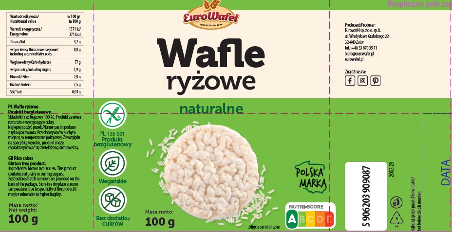 Odkryj smak zdrowia z , bezglutenowymi waflami ryżowymi od Eurowafel! Te chrupiące przekąski to doskonały wybór dla każdego. Wafle są wytwarzane wyłącznie z wysokiej jakości ryżu bez dodatku soli i cukrów, posiadają certyfikat bezglutenowy – przekreślonego kłosa. Idealnie sprawdzą się jako podstawa do różnorodnych dań – możesz je podać z ulubionymi pastami, dżemami czy serami. Dzięki swojej uniwersalności, wafle ryżowe są świetnym rozwiązaniem na szybkie śniadanie, zdrową przekąskę czy dodatek do lunchu. To produkt dla całej rodziny. Odpowiedni dla wegan i osób na diecie bezglutenowej.