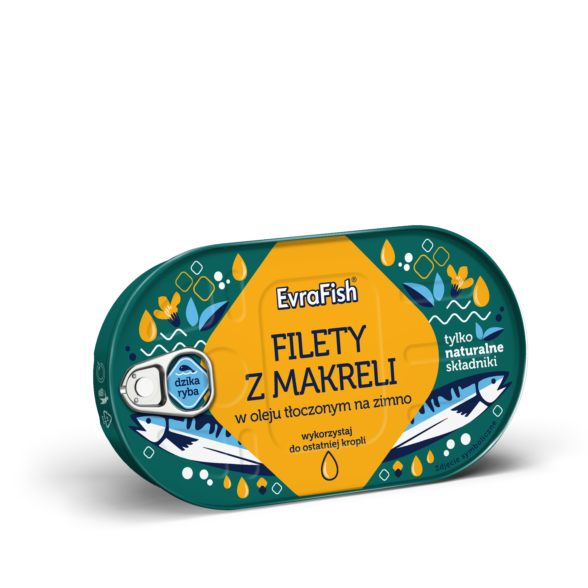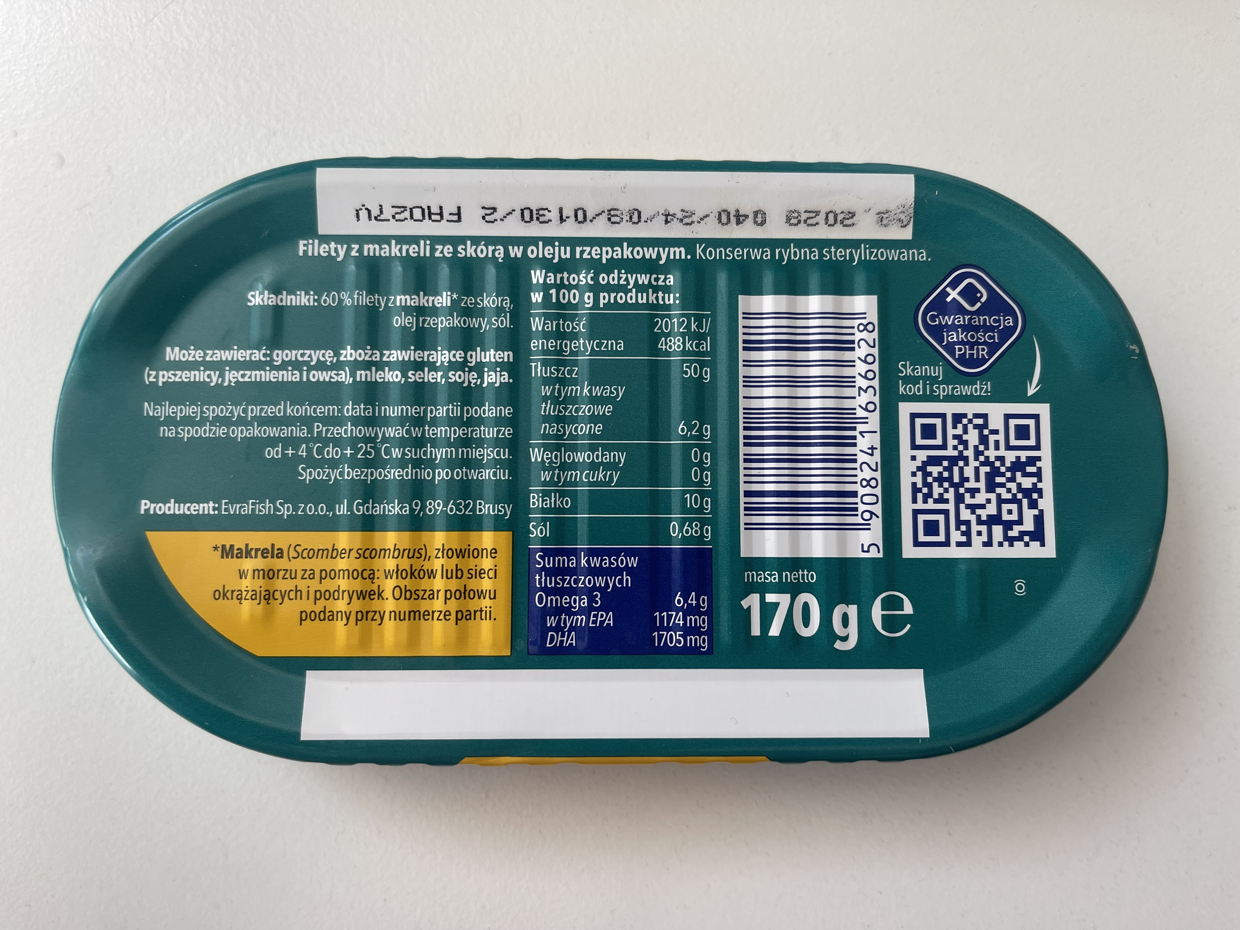 | Składniki | 60% filety ze makreli ze skórą [I-makrela kolias (Scomber japonicus), II-makrela (Scomber scombrus)]*, 40% olej rzepakowy, sól. |