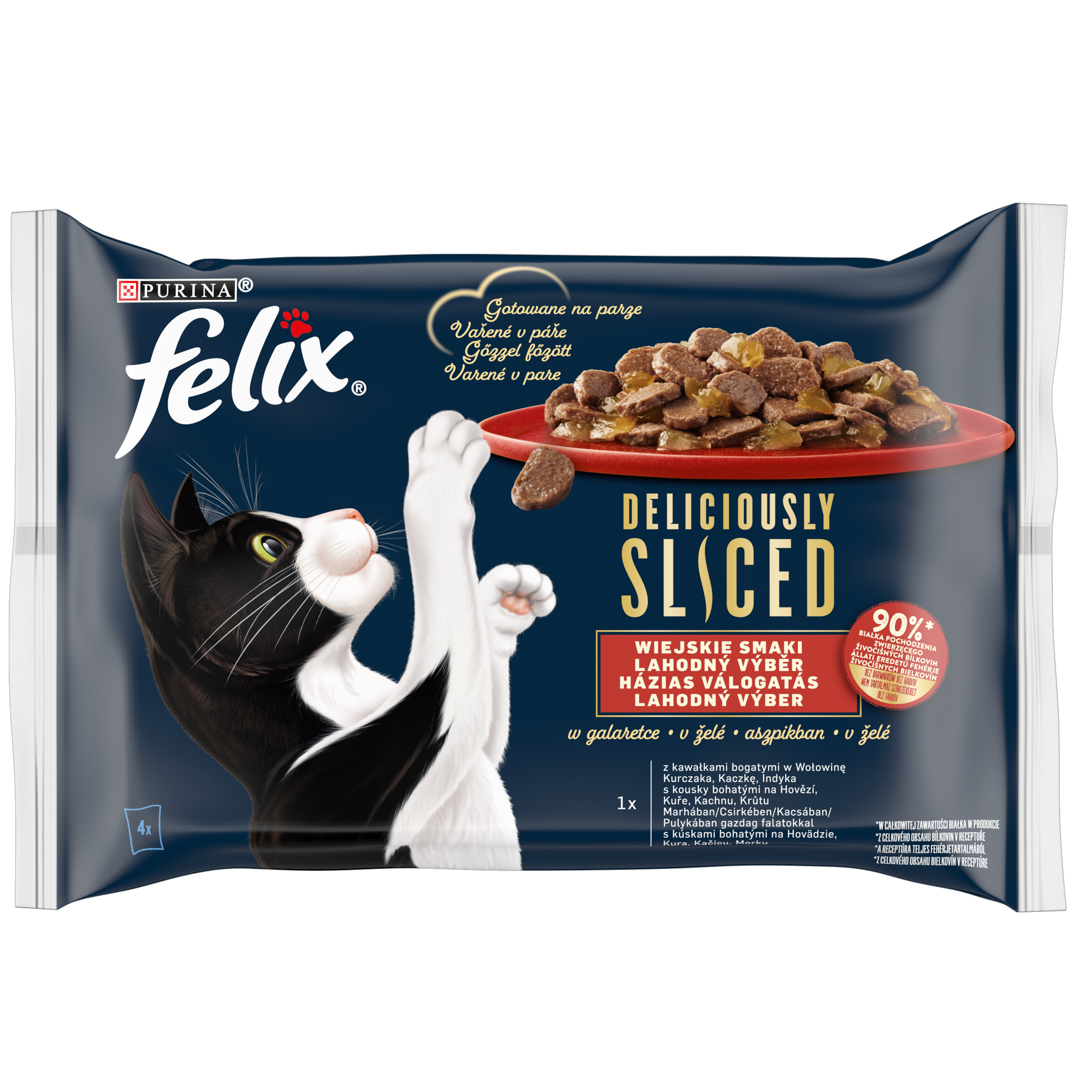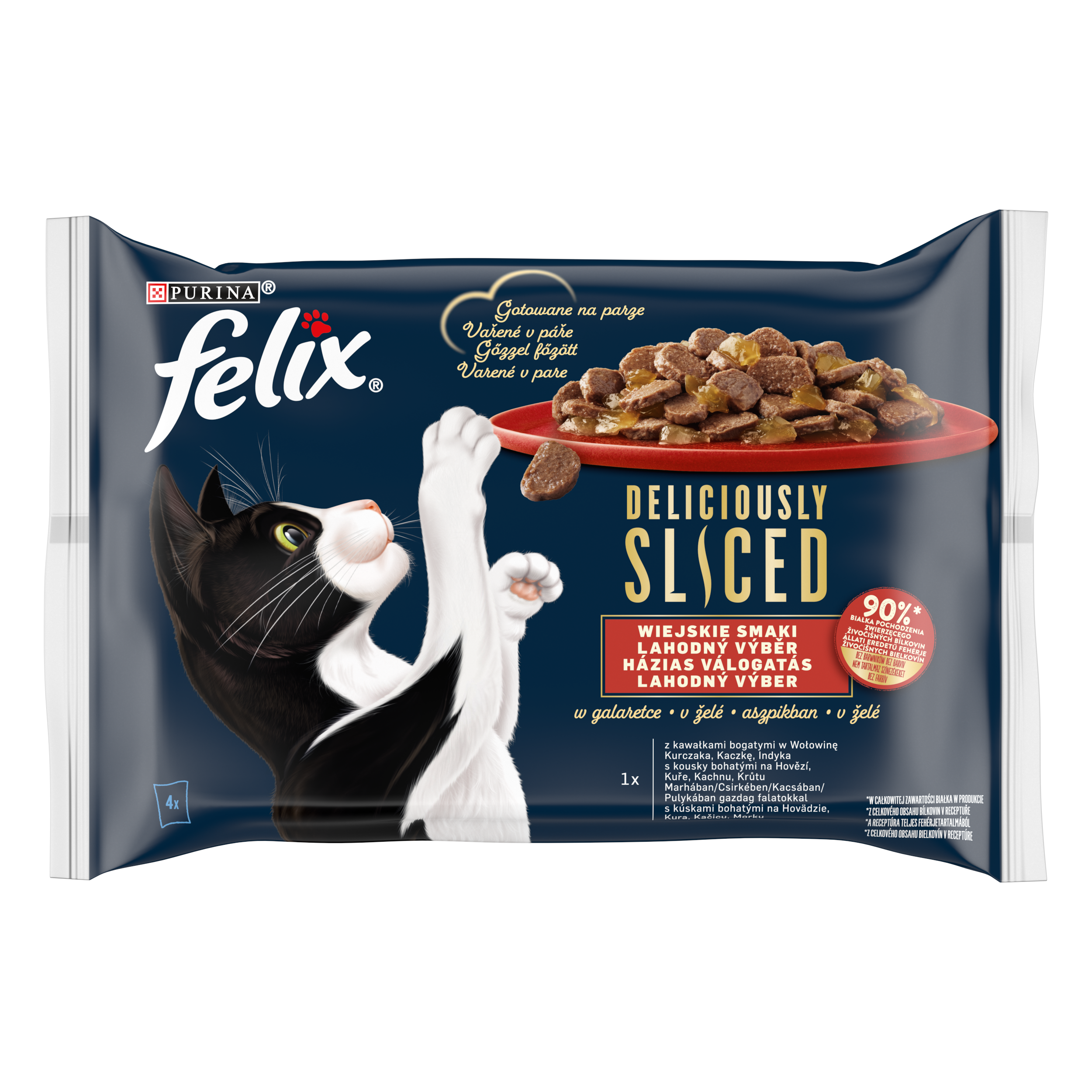 FELIX® Deliciously Sliced to wyśmienite, ugotowane na parze plasterki, bogate w białko i pokryte smaczną galaretką, które Twój kot pokocha! Wyglądają, pachną i smakują tak pysznie, jak potrawy, które mógłbyś ugotować sam! Każde danie zostało przygotowywane na parze, aby wykorzystać pełen potencjał składników i uwolnić ich wyraziste smaki. Wyjątkowe, niezwykle delikatne plasterki podane są w przepysznej galaretce. A to nie wszystko! Posiłki FELIX® Deliciously Sliced dostępne są w szerokiej gamie smakowitych posiłków, aby każdego dnia zaspokajać uwielbienie Twojego kota dla różnorodności. FELIX® - nieodparta przyjemność dla Twojego kota!