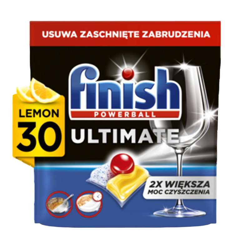 Kapsułki zapewniają również skuteczną ochronę filtrów zmywarki oraz szkła i zapobiegają osadzaniu się kamienia. Finish Ultimate działają w niskich temperaturach. Płynny Powerball zapewnia blask.