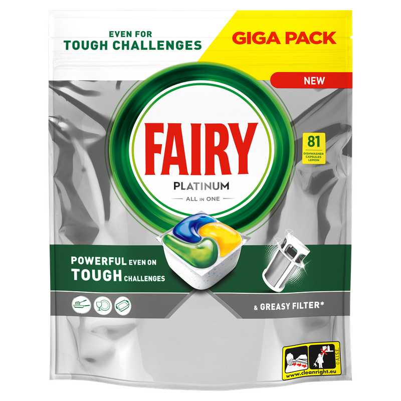 Kapsułki do zmywarki All In One Fairy Platinum działają już przy 1. myciu i usuwają nawet trudne zabrudzenia, pozostawiając naczynia czyste i lśniące. Dzięki mocy czyszczenia kapsułek do zmywarki Fairy Platinum możesz bez obaw przygotowywać wszelkie posiłki, wiedząc, że poradzą sobie nawet z tłustym filtrem, a naczynia i zmywarka będą czyste i pachnące świeżością. Kapsułki do zmywarki Fairy to połączenie płynu i proszku w jednej wydajnej kapsułce. Nasze kapsułki rozpuszczają się niezwykle szybko, dzięki czemu od razu zaczynają działać. A ich użycie jest bardzo proste. Nie musisz ich rozpakowywać. Wystarczy umieścić je w dozowniku detergentu zmywarki do naczyń.