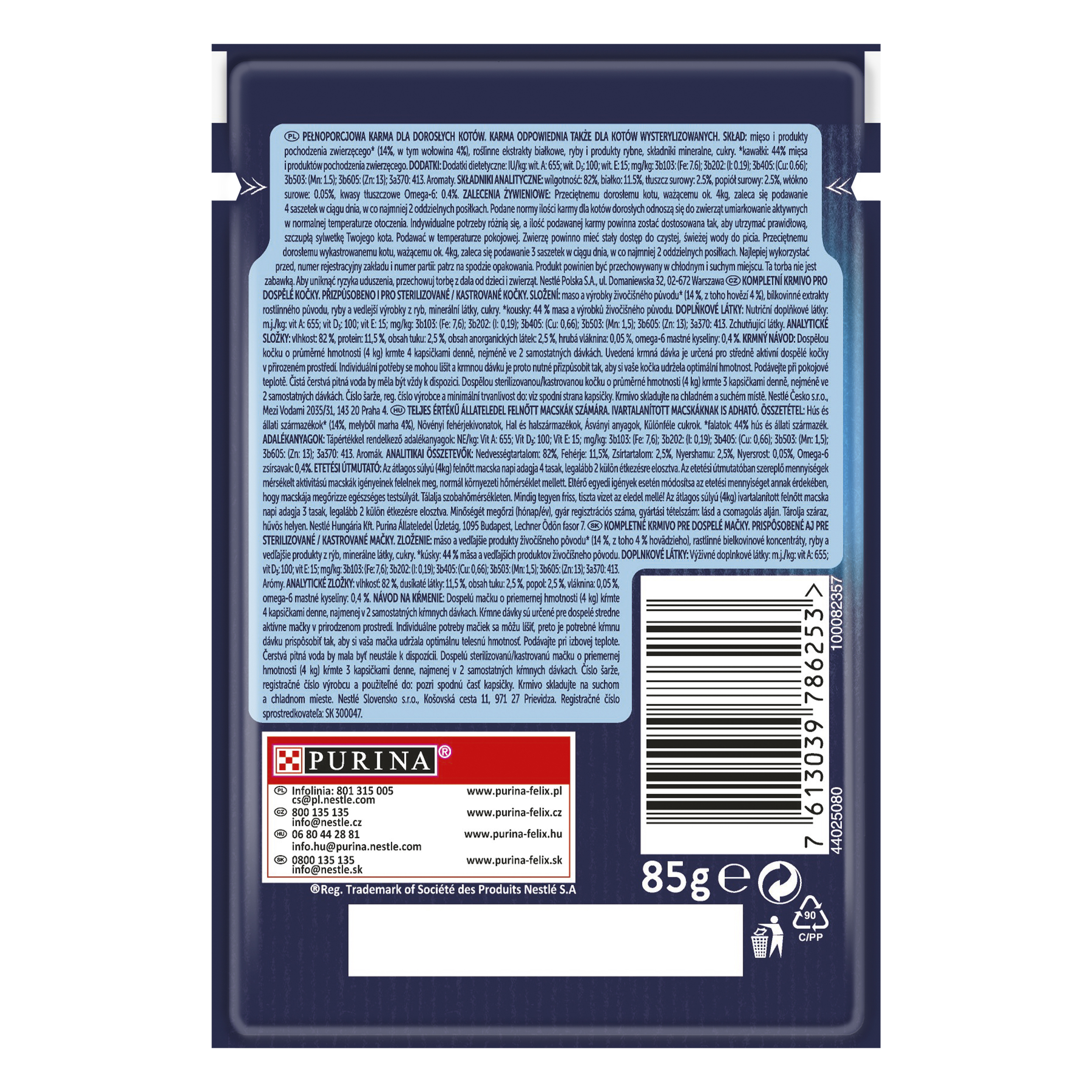 ZALECENIA ŻYWIENIOWE: Przeciętnemu dorosłemu kotu, ważącemu ok. 4kg, zaleca się podawanie 4 saszetek w ciągu dnia, w co najmniej 2 oddzielnych posiłkach. Podane normy ilości karmy dla kotów dorosłychh odnoszą się do zwierząt umiarkowanie aktywnych w normalnej temperaturze otoczenia. Indywidualne potrzeby różnią się, a ilość podawanej karmy powinna zostać dostosowana tak, aby utrzymać prawidłową, szczupłą sylwetkę Twojego kota. Podawać w temperaturze pokojowej. Zwierzę powinno mieć stały dostęp do czystej, świeżej wody do picia. Przeciętnemu dorosłemu, wysterylizowanemu kotu, ważącemu ok. 4kg zaleca się podawanie 3 saszetek w ciągu dnia, w co najmniej 2 oddzielnych posiłkach.