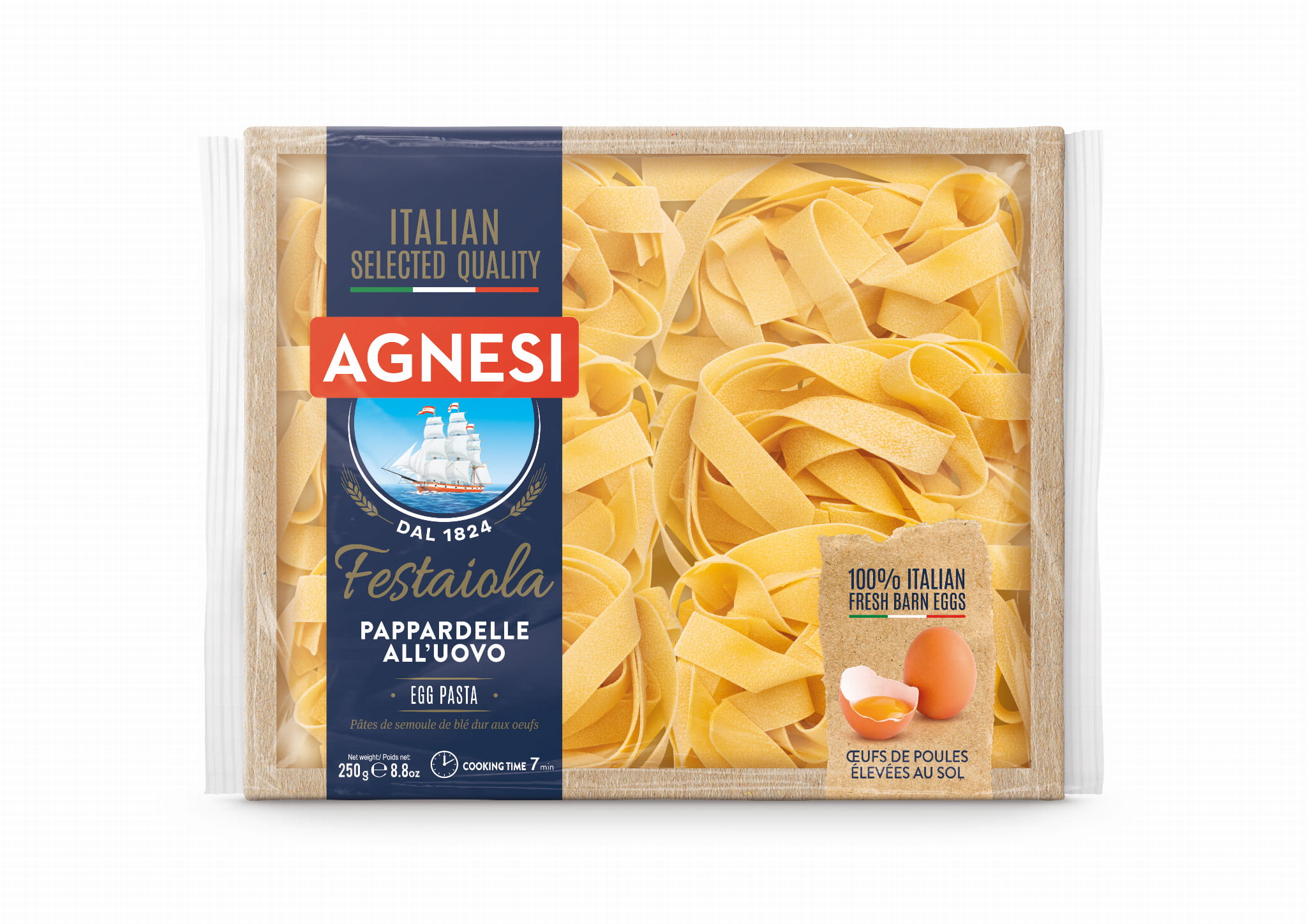 Makaron Festaiola wytwarzany jest z bardzo wysokiej jakości pszenicy durum (odmiana Kronos), do makaronu dodawane są wyłącznie świeże jaja W PROPORCJI 6 JAJ NA 1 KG MĄKI. Dzięki takiej proporcji składników makaron charakteryzuje się wyjątkowym, delikatnym smakiem i doskonałą przyczepnością do sosu.