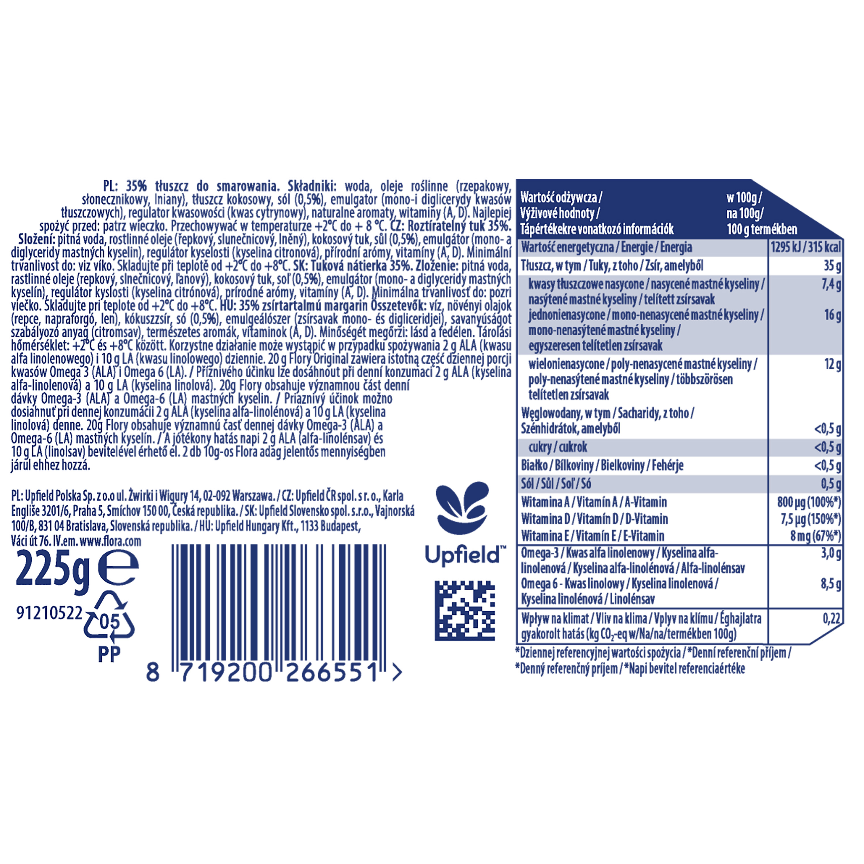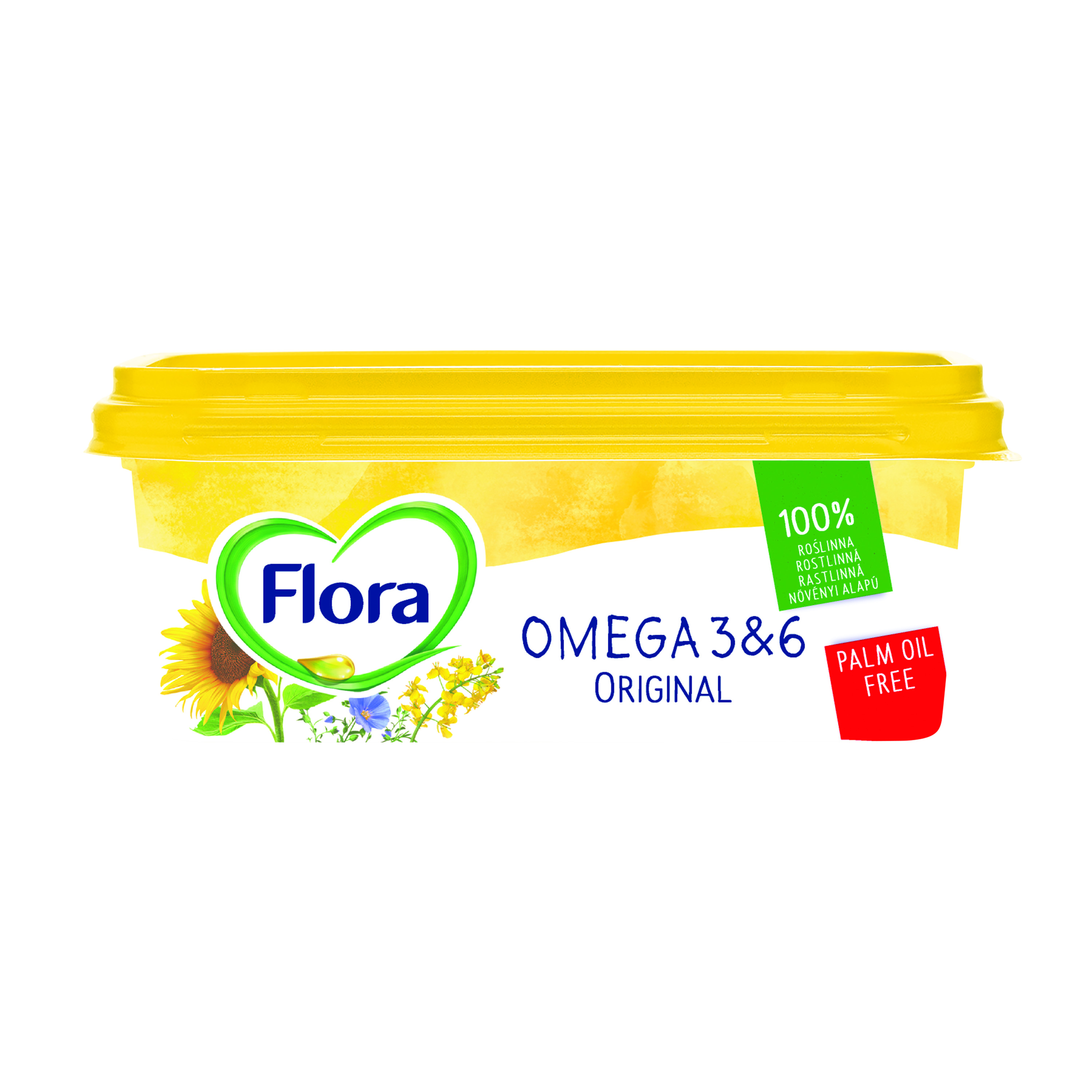 Tłuszcz roślinny do smarowania 35%. Flora jest w 100% roślinna, wegańska, a teraz już bez oleju palmowego. To źródło Omega 3 i Omega 6. Zawiera witaminę E, a zawarte w niej kwasy tłuszczowe omega-3 pochodzą z oleju lnianego, natomiast kwasy omega-6 pochodzą z oleju słonecznikowego. Ich spożywanie, w ramach zbilansowanej diety i zdrowego stylu życia, pomaga utrzymać prawidłowy poziom cholesterolu we krwi, a tym samym wspierać zdrowie serca.
