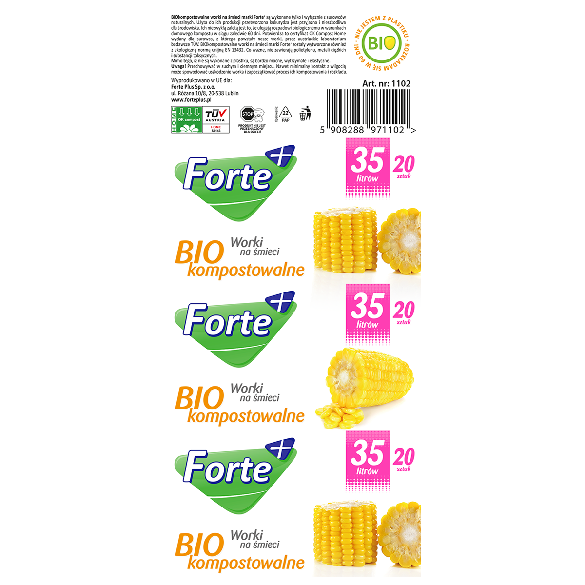 BIOkompostowalne worki na śmieci marki Forte+ są wykonane tylko i wyłącznie z surowców . Użyta do ich produkcji przetworzona kukurydza jest przyjazna i nieszkodliwa dla środowiska. Ich niezwykłą zaletą jest to, że ulegają rozpadowi biologicznemu w warunkach domowego kompostu w ciągu zaledwie 60 dni. Potwierdza to certyfikat OK Compost Home wydany dla surowca, z którego powstały nasze worki, przez austriackie laboratorium badawcze TÜV. BIOkompostowalne worki na śmieci marki Forte+ zostały wytworzone również z ekologiczną normą unijną EN 13432. Co ważne, nie zawierają polietylenu, metali ciężkich i substancji toksycznych. Mimo tego, iż nie są wykonane z plastiku, są bardzo mocne, wytrzymałe i elastyczne.