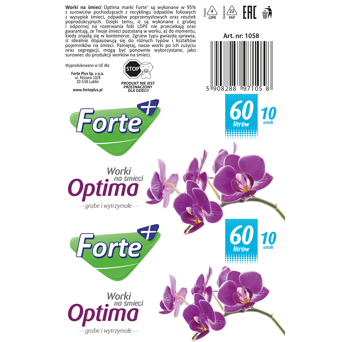 Worki na śmieci Optimum marki Forte+ są wykonane w 95% z surowców pochodzących z recyklingu odpadów foliowych z wysypisk śmieci, odpadów poprzemysłowych oraz resztek poprodukcyjnych. Dzięki temu, iż są wykonane z grubej i odpornej na rozerwania folii LDPE nie przeciekają oraz gwarantują, że Twoje śmieci pozostaną w worku, aż do momentu, kiedy znajdą się w kontenerze. Zgrzew typu gwiazda sprawia, iż idealnie dopasowują się do różnych typów i kształtów pojemników na śmieci. Pamiętaj, nasze worki po ich zużyciu oraz segregacji, mogą być ponownie wykorzystane, jako surowiec do produkcji worków na śmieci.