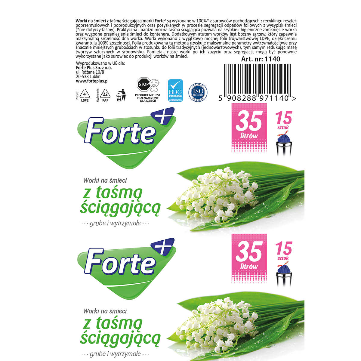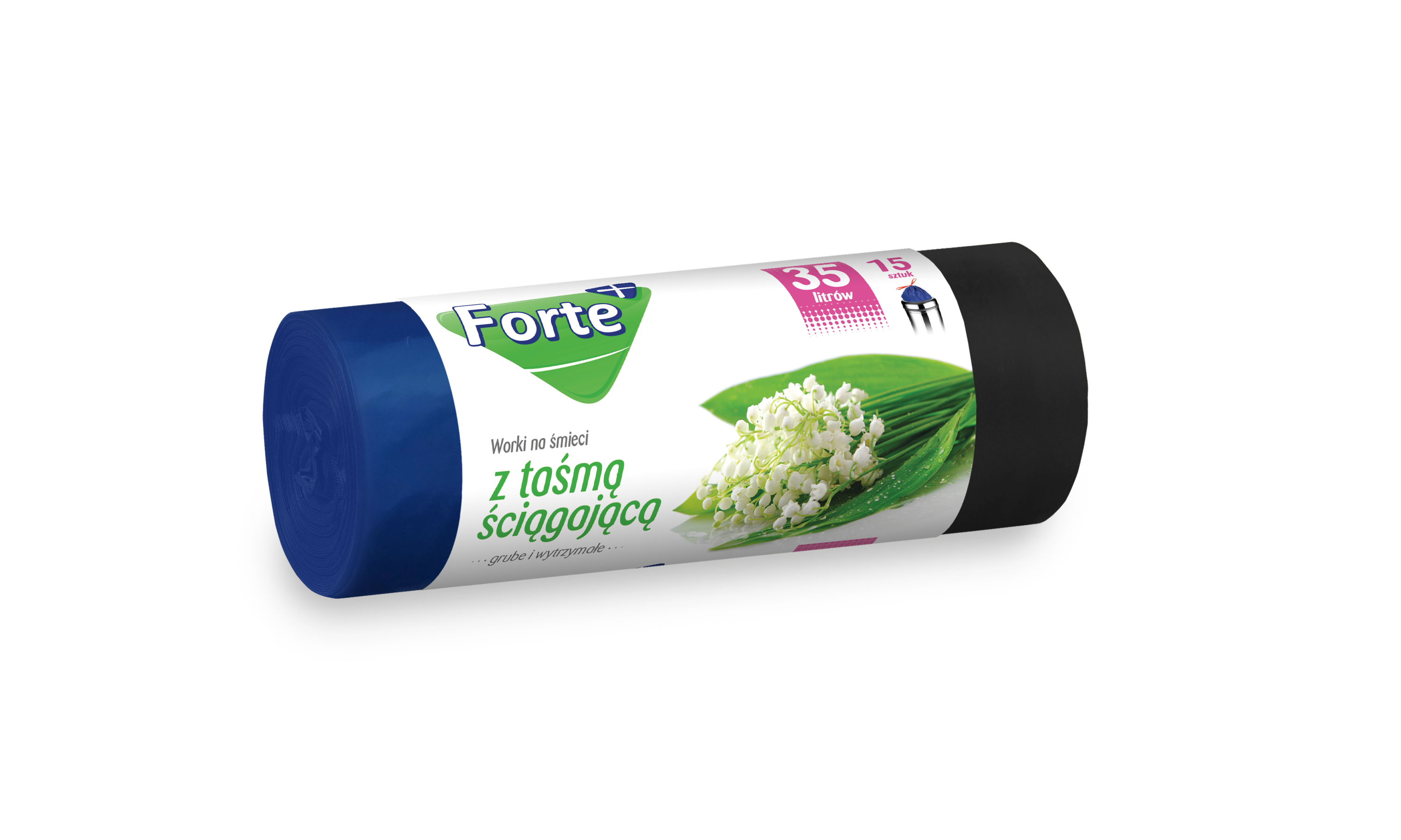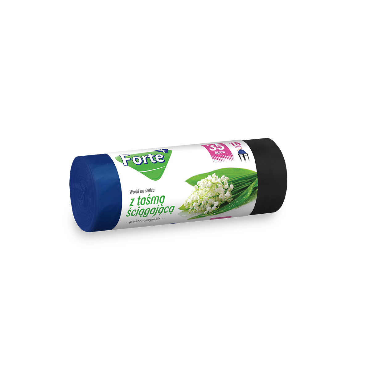 Zawiązywane worki na śmieci marki Forte+ są wykonane w 100% z surowców pochodzących z recyklingu resztek poprzemysłowych i poprodukcyjnych oraz pozyskanych w procesie segregacji odpadów foliowych z wysypisk śmieci. Praktyczne wypustki w górnej części worka pozwalają na jego szybkie i higieniczne zawiązanie oraz wygodne przeniesienie śmieci do kontenera. Zgrzew dna typu gwiazda sprawia, iż idealnie dopasowują się do różnych typów i kształtów pojemników na śmieci. Worki wykonano z wyjątkowo mocnej folii trójwarstwowej LDPE, dzięki czemu gwarantują 100% szczelności. Folia produkowana tą metodą uzyskuje maksymalne parametry wytrzymałościowe przy znacznie mniejszych grubościach w stosunku do folii (jednowarstwowych), tym samym redukując masę tworzyw sztucznych w środowisku.