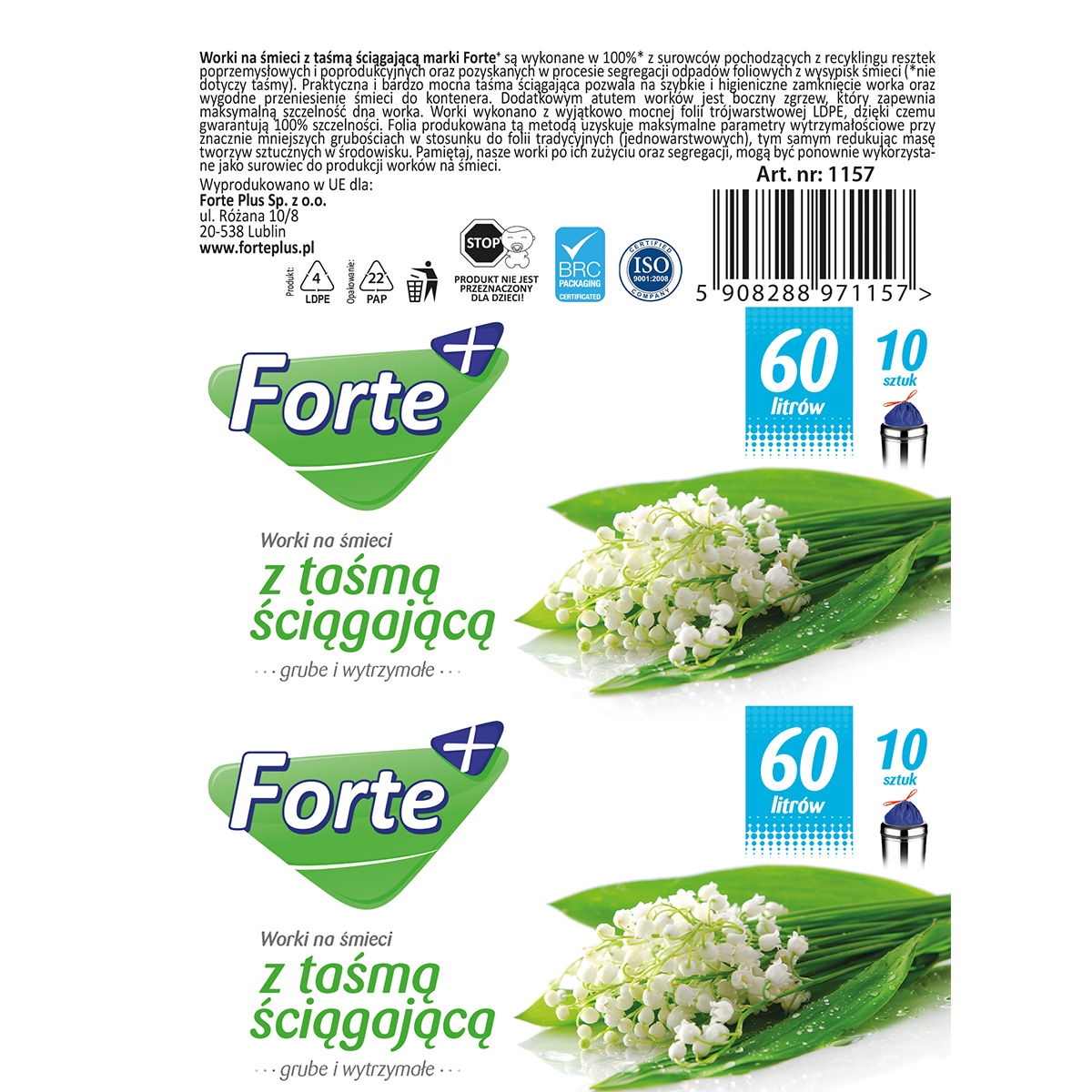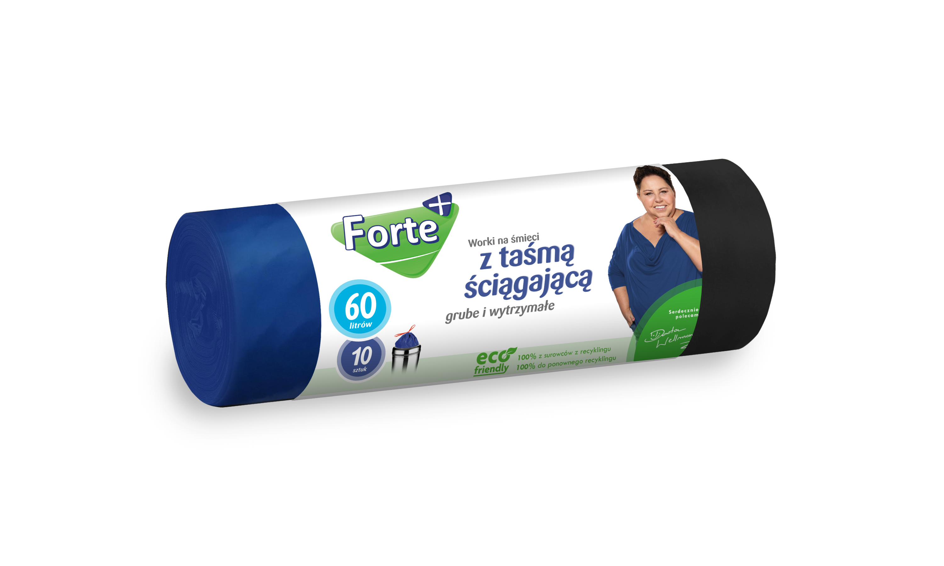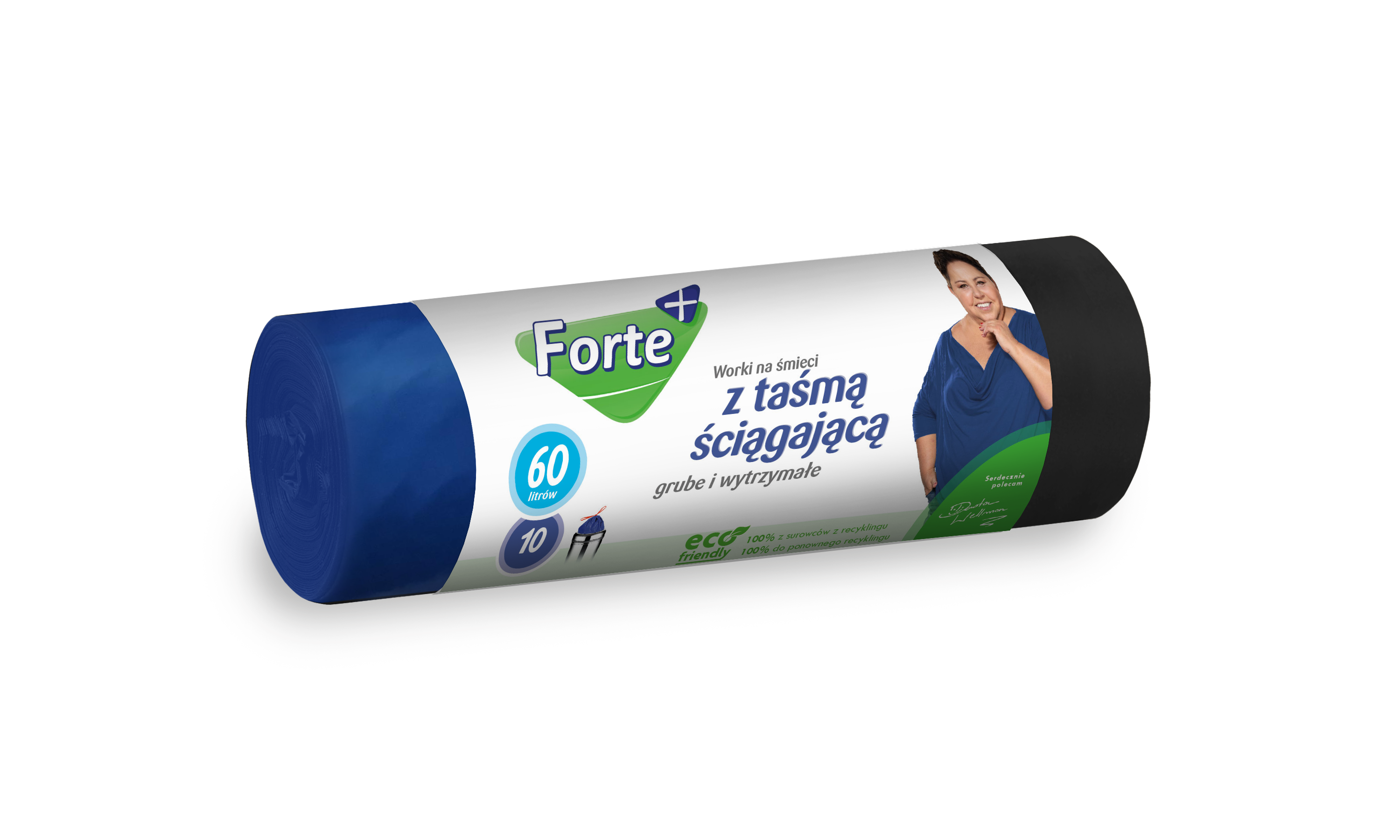 Zawiązywane worki na śmieci marki Forte+ są wykonane w 100% z surowców pochodzących z recyklingu resztek poprzemysłowych i poprodukcyjnych oraz pozyskanych w procesie segregacji odpadów foliowych z wysypisk śmieci. Praktyczne wypustki w górnej części worka pozwalają na jego szybkie i higieniczne zawiązanie oraz wygodne przeniesienie śmieci do kontenera. Zgrzew dna typu gwiazda sprawia, iż idealnie dopasowują się do różnych typów i kształtów pojemników na śmieci. Worki wykonano z wyjątkowo mocnej folii trójwarstwowej LDPE, dzięki czemu gwarantują 100% szczelności. Folia produkowana tą metodą uzyskuje maksymalne parametry wytrzymałościowe przy znacznie mniejszych grubościach w stosunku do folii (jednowarstwowych), tym samym redukując masę tworzyw sztucznych w środowisku.