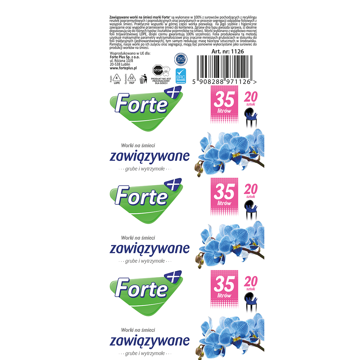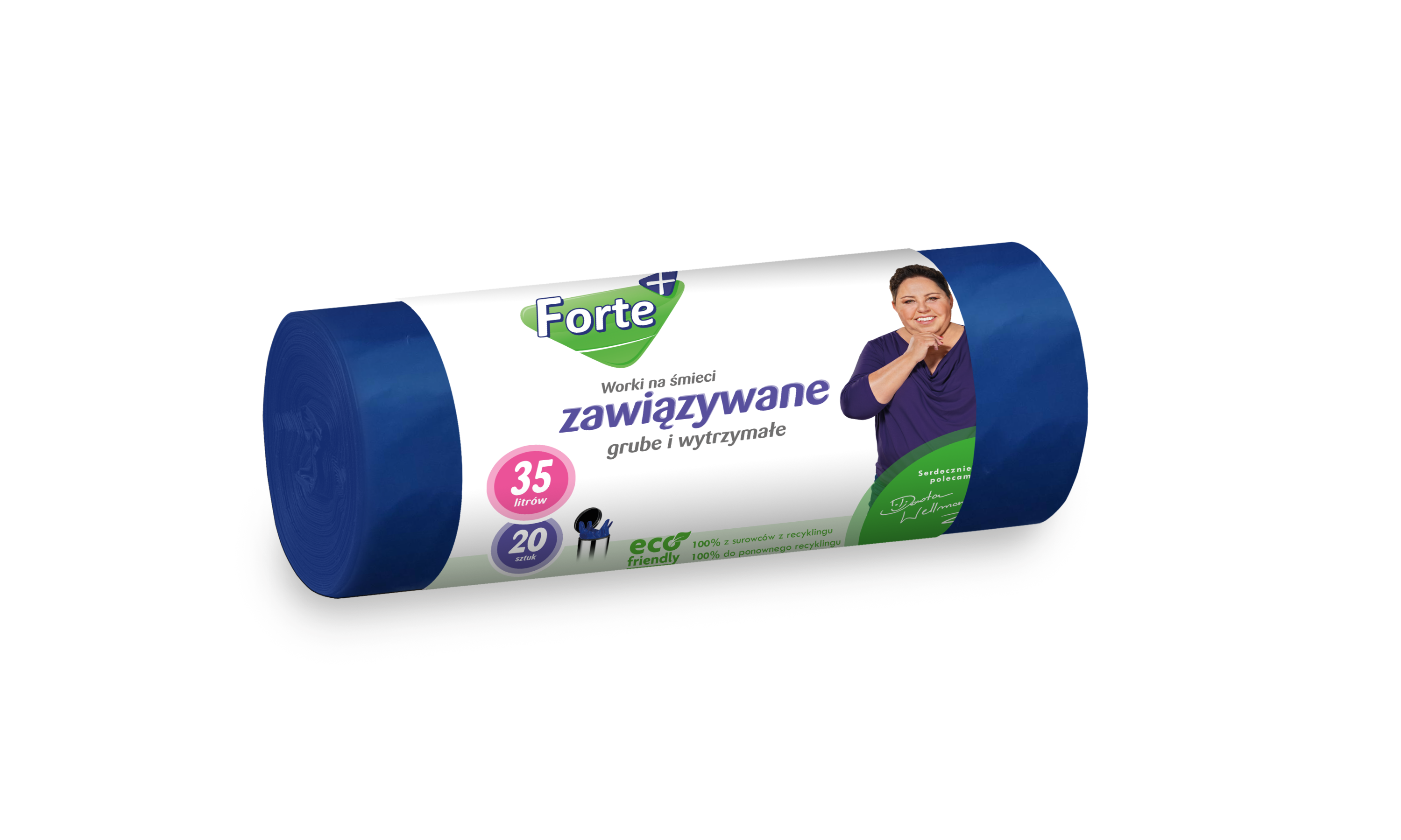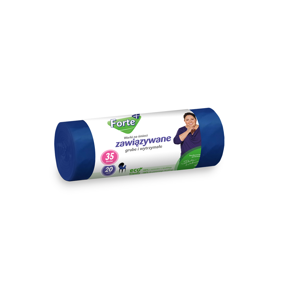 Zawiązywane worki na śmieci marki Forte+ są wykonane w 100% z surowców pochodzących z recyklingu resztek poprzemysłowych i poprodukcyjnych oraz pozyskanych w procesie segregacji odpadów foliowych z wysypisk śmieci. Praktyczne wypustki w górnej części worka pozwalają na jego szybkie i higieniczne zawiązanie oraz wygodne przeniesienie śmieci do kontenera. Zgrzew dna typu gwiazda sprawia, iż idealnie dopasowują się do różnych typów i kształtów pojemników na śmieci. Worki wykonano z wyjątkowo mocnej folii trójwarstwowej LDPE, dzięki czemu gwarantują 100% szczelności. Folia produkowana tą metodą uzyskuje maksymalne parametry wytrzymałościowe przy znacznie mniejszych grubościach w stosunku do folii (jednowarstwowych), tym samym redukując masę tworzyw sztucznych w środowisku.