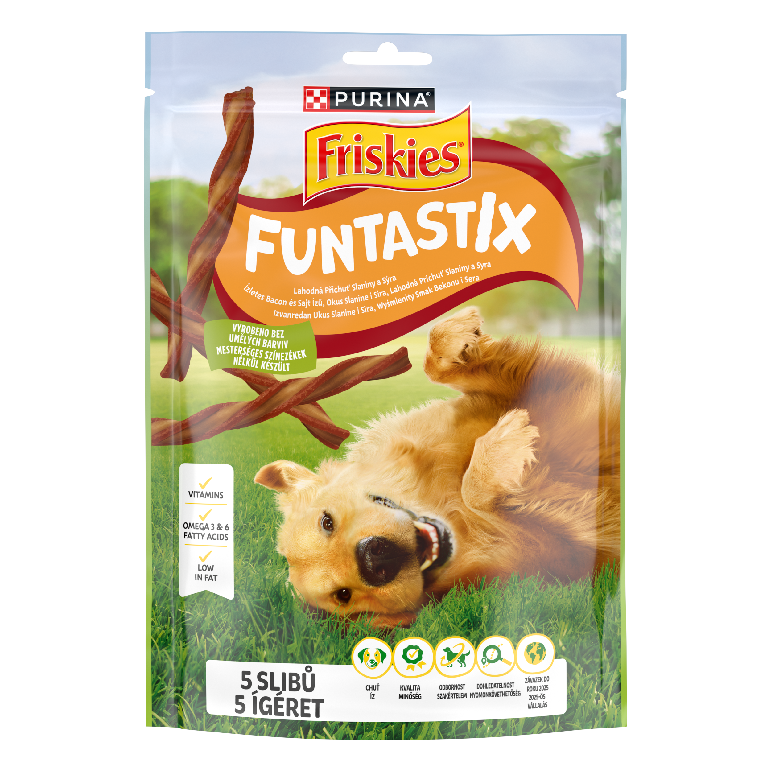 Friskies Funstix może być podawany w dowolnym momencie jako przysmak, lub nagroda, zarówno w całości, jak i podzielony na kawałki wielkości jednego kęsa.