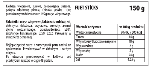 | Składniki | Mięso wieprzowe, laktoza (z mleka), sól, dekstryna, dekstroza, przyprawy aromaty, aromat dymu wędzarniczego, przeciwutleniacz: e301, substancje konserwujące: e250, e 252 pakowany w atmosferze ochronnej. |