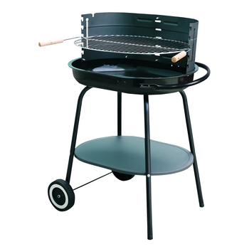 Grill owalny, misa i owiewka (60 cm x 42 cm) stalowa, emaliowana, ruszt - stal chromowana, wyposażenie: kółka, dolna półka, wysokość 84 cm.