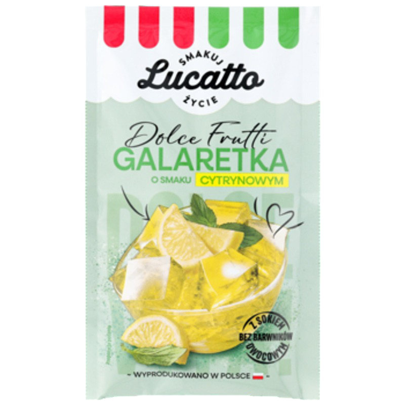 Skosztuj pysznych, mocno owocowych galaretek Lucatto! Galaretka cytrynowa to orzeźwiający deser o intensywnym smaku i aromacie soczystych cytryn. Klarowna, szybko tężeje i świetnie komponuje się z owocami, bitą śmietaną lub jako lekka dekoracja ciast.