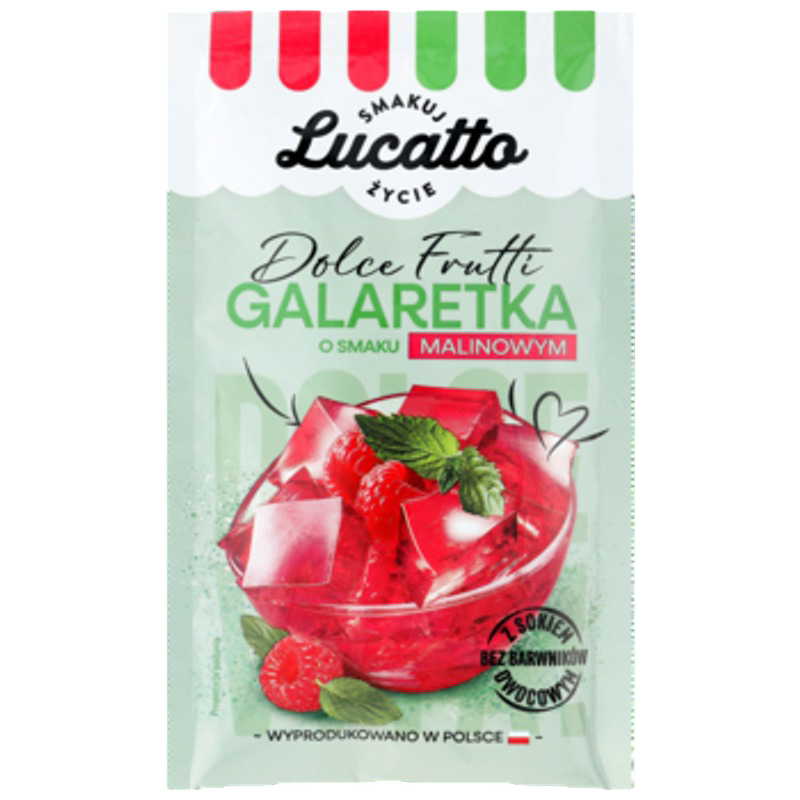 Skosztuj pysznych, mocno owocowych galaretek Lucatto! Galaretka malinowa to wyjątkowy deser o głębokim smaku i aromacie dojrzałych malin. Klarowna, szybko tężeje i doskonale smakuje solo, z owocami, bitą śmietaną albo jako eleganckie wykończenie wypieków.