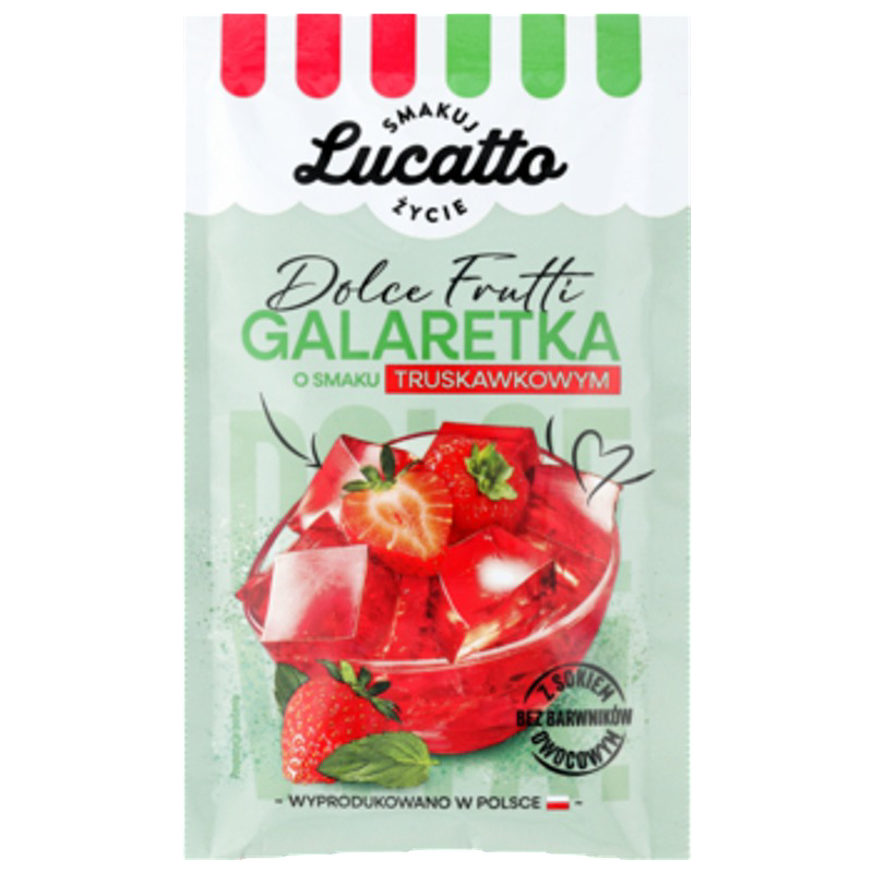 Skosztuj pysznych, mocno owocowych galaretek Lucatto! Galaretka truskawkowa to klasyczny deser o intensywnym smaku i aromacie dojrzałych truskawek. Klarowna, szybko tężeje i doskonale sprawdza się solo, z owocami, bitą śmietaną lub jako dekoracja ciast.