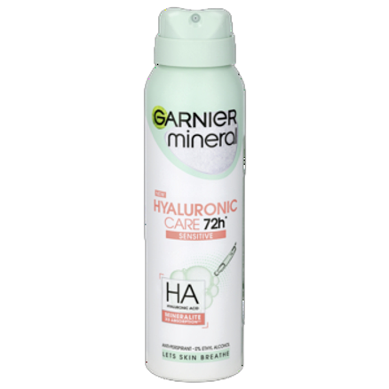 Pierwszy od Garnier antyperspirant z kwasem hialuronowym pochodzenia roślinnego i Mineralite, łagodzi wrażliwą skórę i chroni przez 72h przed przykrym zapachem. Pozwala skórze oddychać. Zapewnia komfort przez cały dzień. Bez alkoholu etylowego.