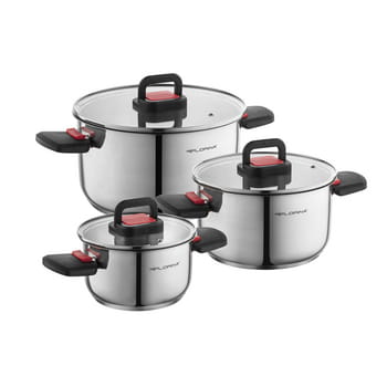 | Zawartość zestawu | Trzy garnki (16x9,5 cm-1,8l; 20x11,5 cm-3,7l; 24x13,5cm-6l), trzy pokrywki |