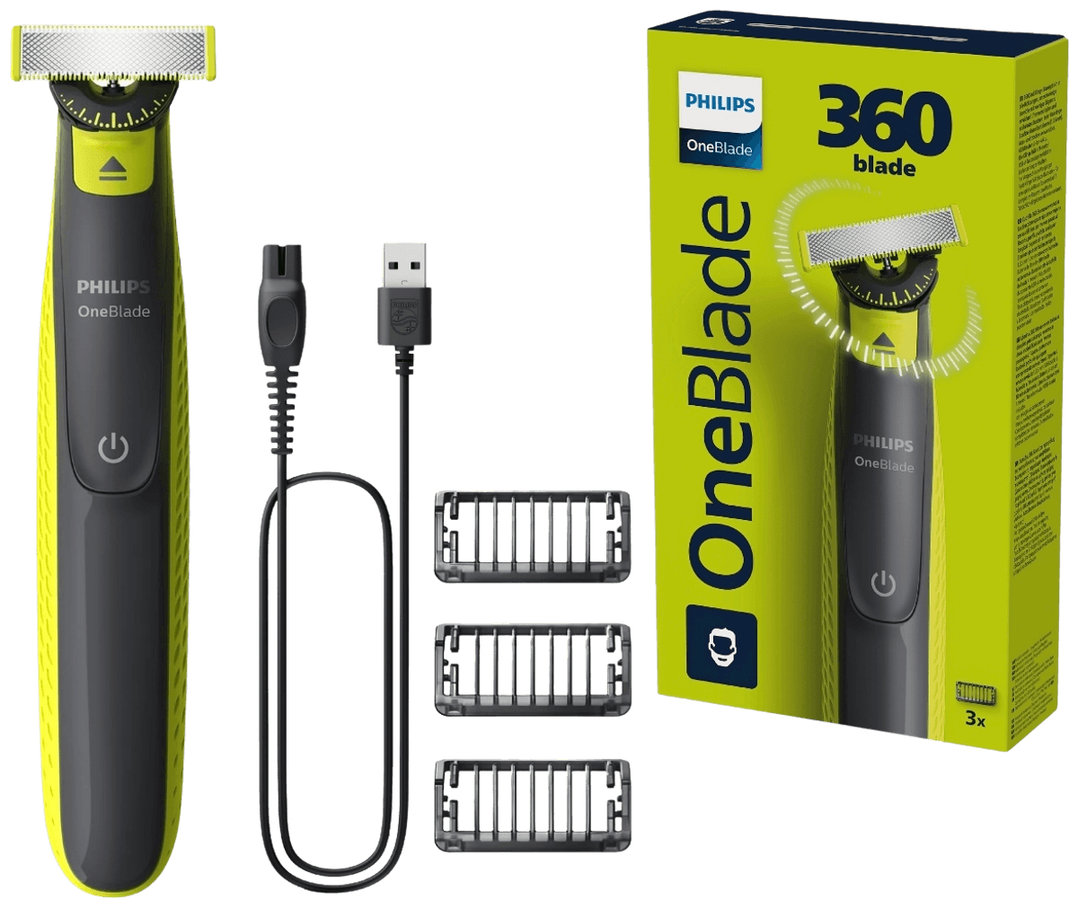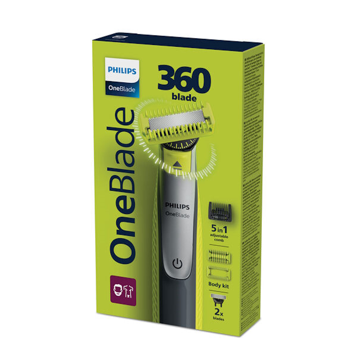 Philips OneBlade 360 QP2834/23 jest wyposażony w rewolucyjną technologię opracowaną z myślą o goleniu zarostu na twarzy. Umożliwia golenie włosów dowolnej długości. Podwójny system ochrony — złożony z zapewniającej poślizg powłoki i zaokrąglonych końcówek — sprawia, że golenie jest łatwiejsze i bardziej komfortowe. Urządzenie jest również wyposażone w szybko poruszający się nożyk (12 000 ruchów na minutę) zapewniający efektywne działanie nawet w przypadku dłuższych włosów. Innowacyjne ostrze 360 porusza się we wszystkich kierunkach, aby dostosować się do kształtów twarzy. Konstrukcja ta zapewnia nieprzerwany kontakt ze skórą i kontrolę. Łatwe przycinanie włosów i golenie w trudno dostępnych miejscach — niebywała wygoda w kilku ruchach. Unikatowa konstrukcja z otwartą nasadką grzebieniową gwarantuje efektywne przycinanie bez zapychania się i zakłócania Twojego dnia — nawet w przypadku długich i grubych włosów. OneBlade dopasowuje się do kształtu twarzy, umożliwiając łatwe i komfortowe przycinanie i golenie całej powierzchni. Przesuwając dwustronne ostrze w dowolnym kierunku, uzyskasz stylowe krawędzie i proste linie. Golarka OneBlade jest całkowicie wodoszczelna, dzięki czemu można ją łatwo umyć pod bieżącą wodą. Umożliwia golenie na sucho i mokro, także pod prysznicem — tak jak lubisz. Nie wymaga stosowania pianki. Golarka Philips OneBlade 360 QP2834/23 posiada nakładaną nasadkę ochronną do wrażliwych miejsc, która dodatkowo zabezpiecza wrażliwe miejsca. Zestaw zawiera również nakładaną nasadkę grzebieniową do ciała (3 mm), dzięki której łatwo można pzryciąć włosy w dowolnym kierunku.