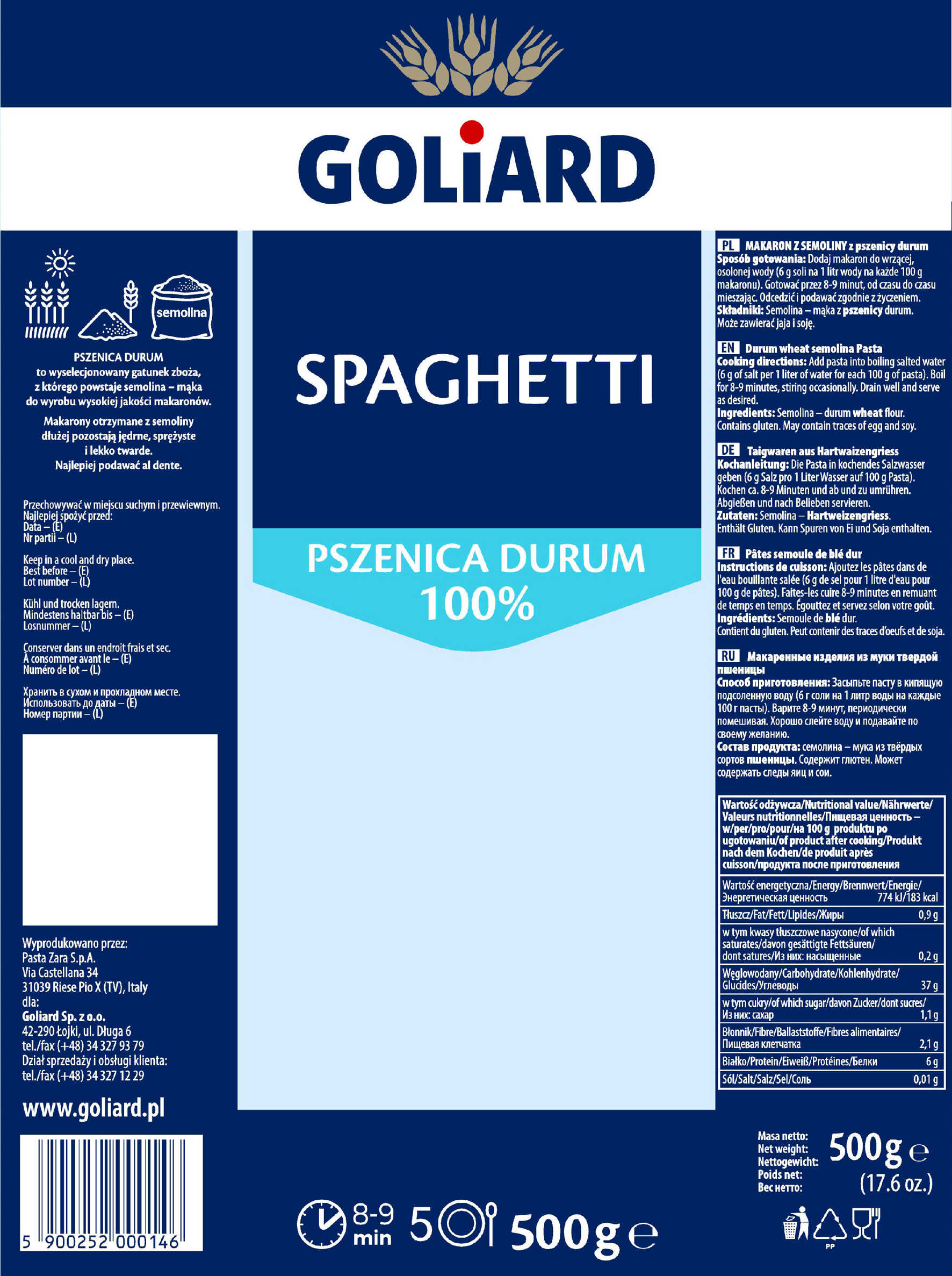 | Składniki | Semolina - z pszenicy durum ( zawiera gluten) , woda. |
