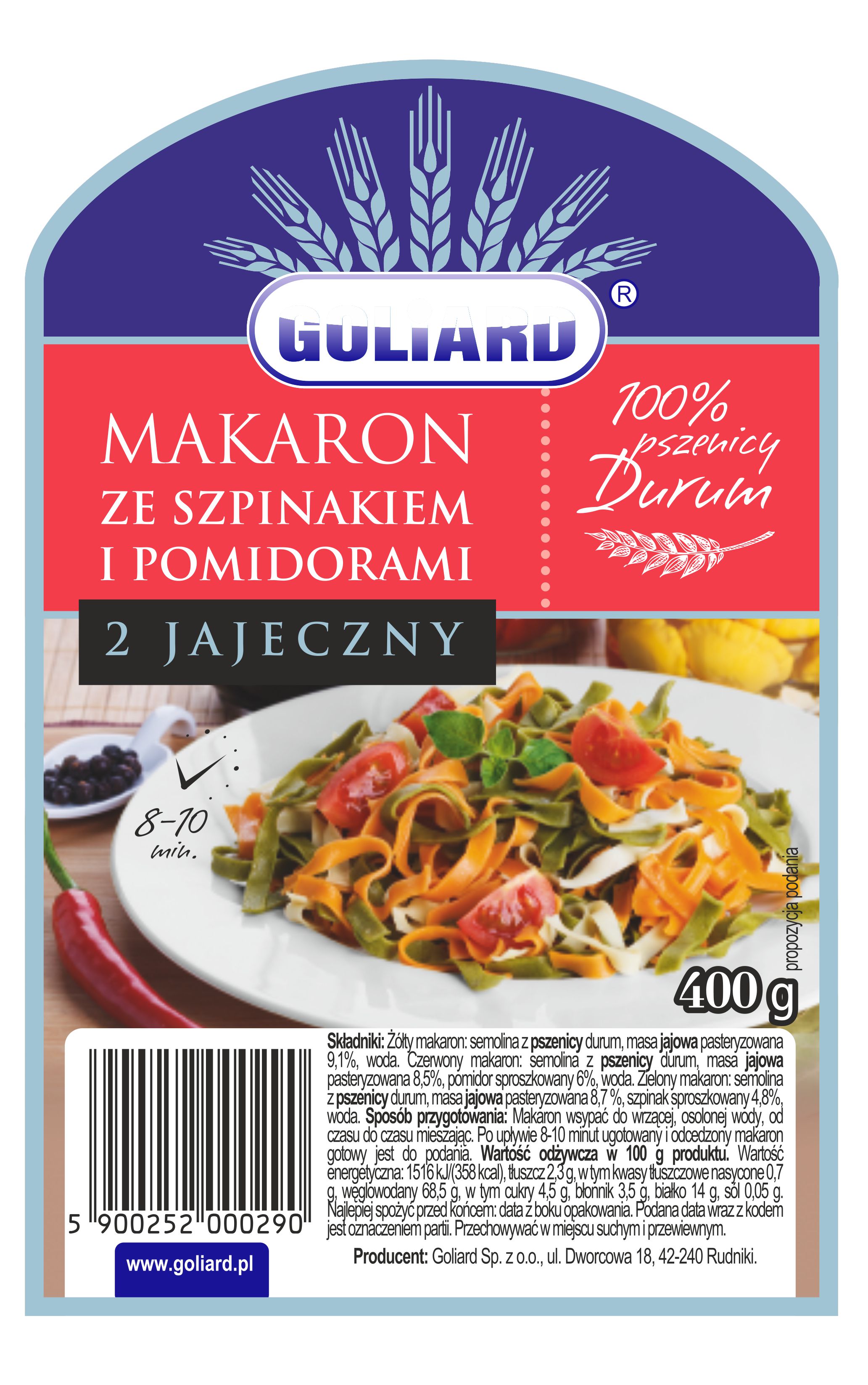 Makaron trójkolorowy produkowany jest z najwyższej jakości mąk z pszenicy durum z dodatkiem odpowiednio sproszkowanych pomidorów i szpinaku oraz wody. Polecany jest do przygotowywania wyszukanych potraw jak i również do różnego rodzaju zup i sosów. Posiada wysokie walory smakowe, które zaspokoją gusta nawet najbardziej wymagających konsumentów.