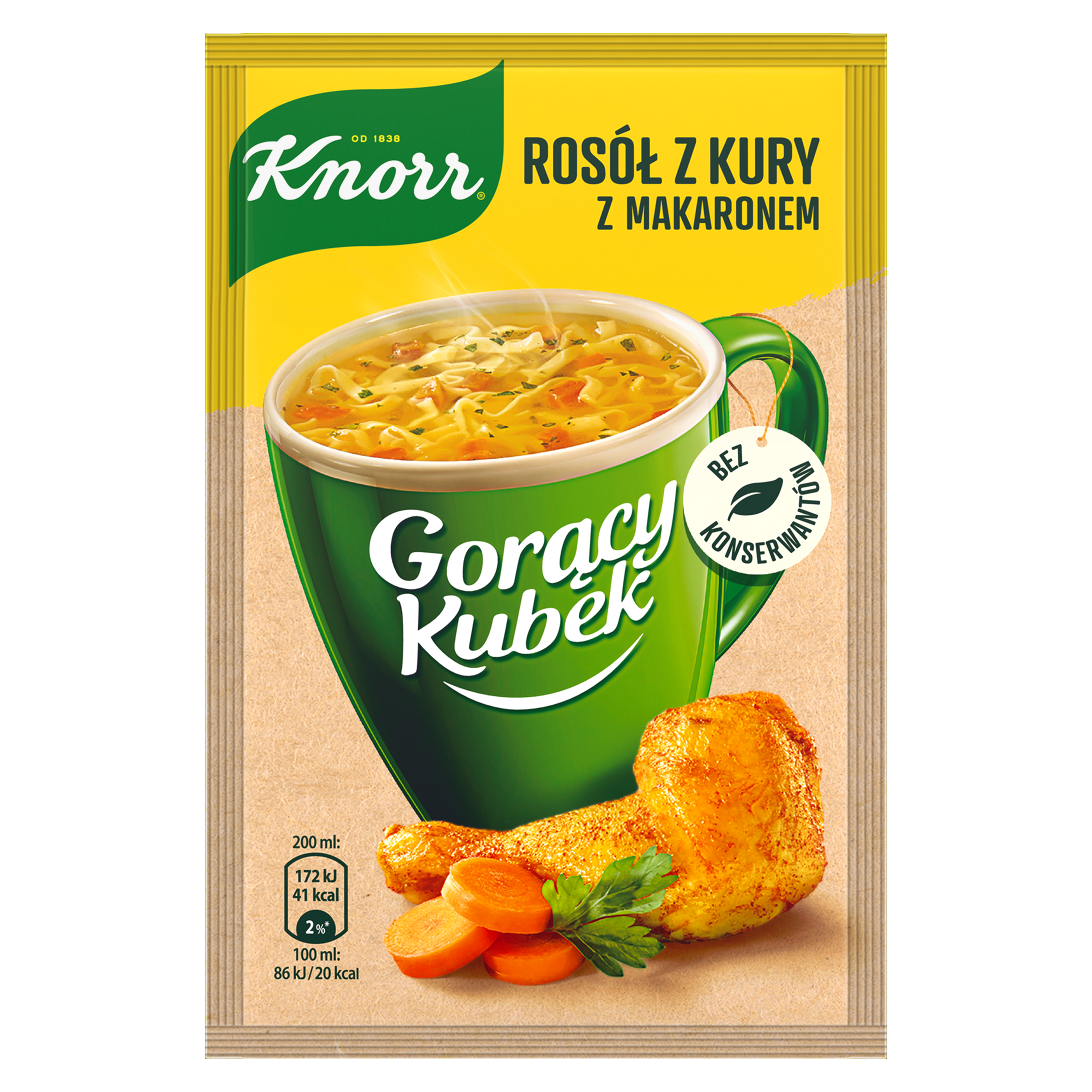 | Składniki | Makaron (36%) (mąka pszenna semolina, sól), syrop glukozowy, sól jodowana, skrobia, cukier, aromaty, sól, ekstrakt drożdżowy, tłuszcz palmowy, marchew (1,8%), tłuszcz kurzy (1%), kurkuma, pieprz, korzeń pietruszki, cebula, natka pietruszki (0,2%), mięso z kurczaka (0,2%), por, przeciwutleniacz: ekstrakty z rozmarynu. może zawierać inne zboża zawierające gluten, seler, jaja, mleko, gorczycę i soję. |