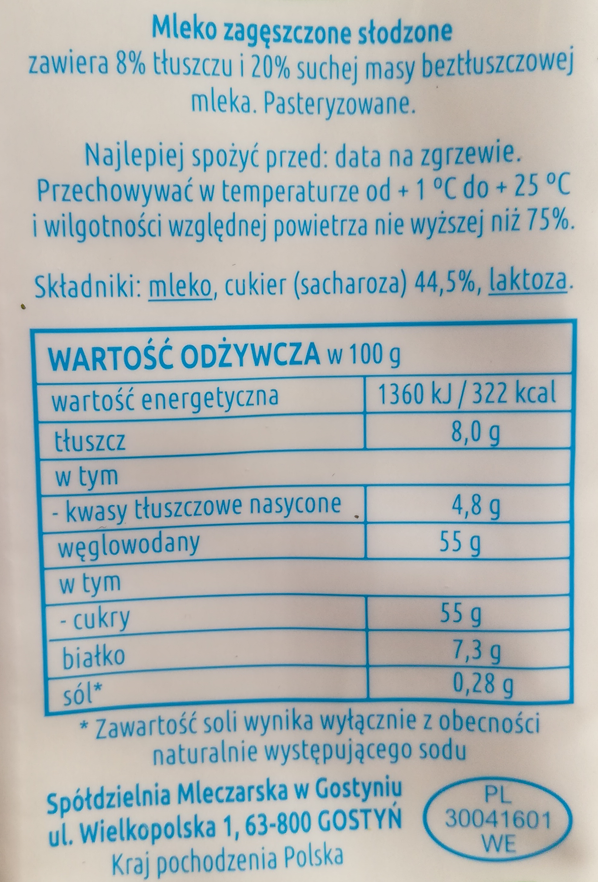 | Składniki | Mleko , sacharoza, , laktoza |