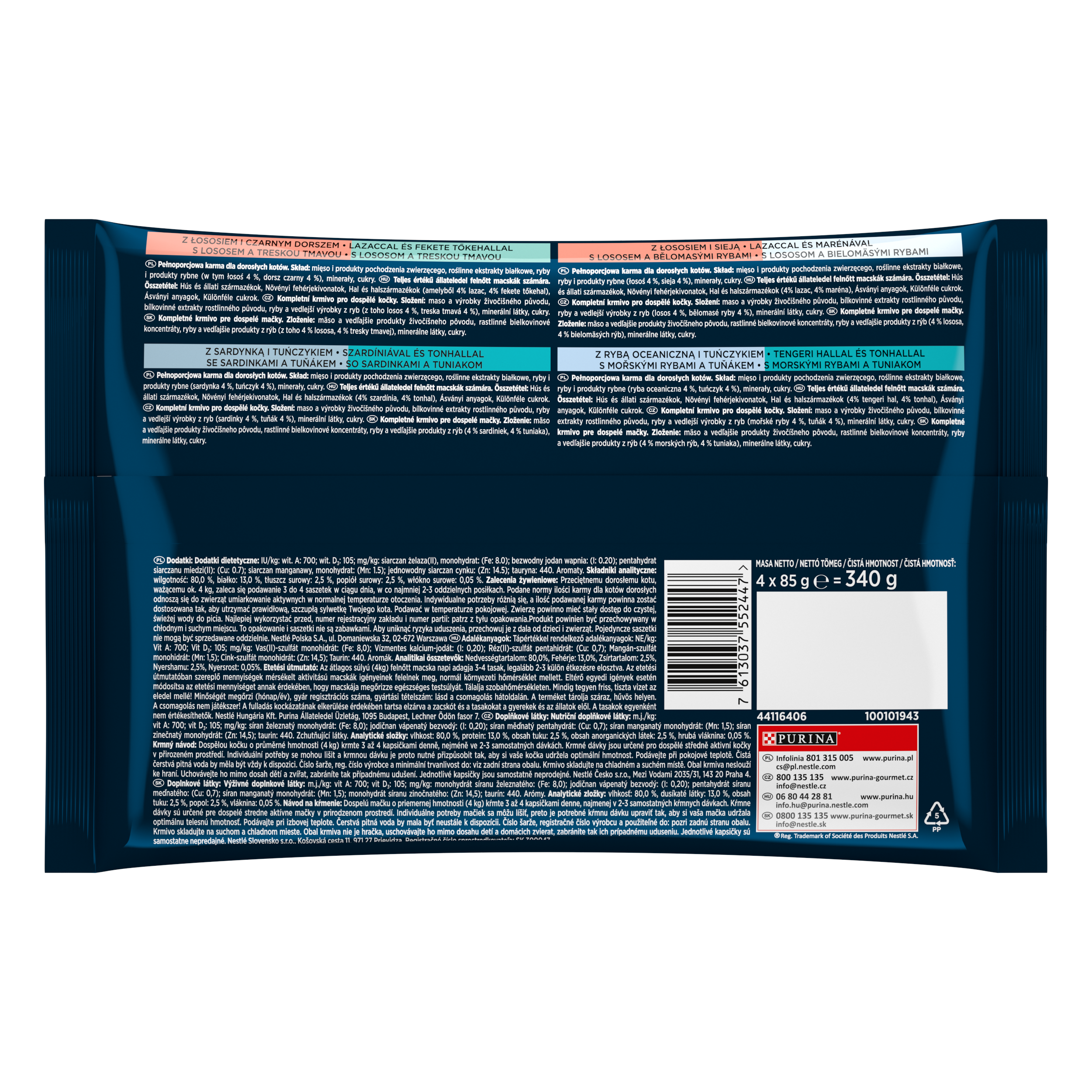 | Skład | Z łososiem i czarnym dorszem: skład: mięso i produkty pochodzenia zwierzęcego, roślinne ekstrakty białkowe, ryby i produkty rybne (w tym łosoś 4%, dorsz czarny 4%), minerały, cukry. dodatki: dodatki dietetyczne: iu/kg: wit. a: 700; wit. d3: 105; mg/kg: siarczan żelaza (ii), monohydrat: (fe: 8.0); bezwodny jodan wapnia: (i: 0.20); pentahydrat siarczanu miedzi (ii): (cu: 0.7); siarczan manganawy, monohydrat: (mn: 1.5); jednowodny siarczan cynku: (zn: 14.5); tauryna: 440. aromaty. składniki analityczne: wilgotność: 80,0%, białko: 13,0%, tłuszcz surowy: 2,5%, popiół surowy: 2,5%, włókno surowe: 0,05%. z sardynką i tuńczykiem: skład: mięso i produkty pochodzenia zwierzęcego, roślinne ekstrakty białkowe, ryby i produkty rybne (sardynka 4%, tuńczyk 4%), minerały, cukry. dodatki: dodatki dietetyczne: iu/kg: wit. a: 700; wit. d3: 105; mg/kg: siarczan żelaza (ii), monohydrat: (fe: 8.0); bezwodny jodan wapnia: (i: 0.20); pentahydrat siarczanu miedzi (ii): (cu: 0.7); siarczan manganawy, monohydrat: (mn: 1.5); jednowodny siarczan cynku: (zn: 14.5); tauryna: 440. aromaty. składniki analityczne: wilgotność: 80,0%, białko: 13,0%, tłuszcz surowy: 2,5%, popiół surowy: 2,5%, włókno surowe: 0,05%. z łososiem i sieją: skład: mięso i produkty pochodzenia zwierzęcego, roślinne ekstrakty białkowe, ryby i produkty rybne (łosoś 4%, biała ryba 4%), minerały, cukry. dodatki: dodatki dietetyczne: iu/kg: wit. a: 700; wit. d3: 105; mg/kg: siarczan żelaza (ii), monohydrat: (fe: 8.0); bezwodny jodan wapnia: (i: 0.20); pentahydrat siarczanu miedzi (ii): (cu: 0.7); siarczan manganawy, monohydrat: (mn: 1.5); jednowodny siarczan cynku: (zn: 14.5); tauryna: 440. aromaty. składniki analityczne: wilgotność: 80,0%, białko: 13,0%, tłuszcz surowy: 2,5%, popiół surowy: 2,5%, włókno surowe: 0,05%. z rybą oceaniczną i tuńczykiem: skład: mięso i produkty pochodzenia zwierzęcego, roślinne ekstrakty białkowe, ryby i produkty rybne (ryba oceaniczna 4%, tuńczyk 4%), minerały, cukry. dodatki: dodatki dietetyczne: iu/kg: wit. a: 700; wit. d3: 105; mg/kg: siarczan żelaza (ii), monohydrat: (fe: 8.0); bezwodny jodan wapnia: (i: 0.20); pentahydrat siarczanu miedzi (ii): (cu: 0.7); siarczan manganawy, monohydrat: (mn: 1.5); jednowodny siarczan cynku: (zn: 14.5); tauryna: 440. aromaty. składniki analityczne: wilgotność: 80,0%, białko: 13,0%, tłuszcz surowy: 2,5%, popiół surowy: 2,5%, włókno surowe: 0,05%. |
