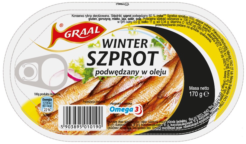 | Składniki | Szprot podwędzany 60%(ryba sprattus sprattus (SPR), złowione w Morzu Północno-Wschodni Atlantyk FAO 27 lub Morze Bałtyckie FAO 27 IIId, narzędzie połowowe: włoki pelagiczne (OTM), olej rzepakowy, sól. |