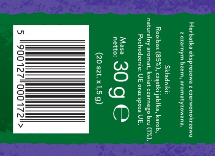 | Składniki | Rooibos (85%), cząstki jabłka, karob, aromat, kwiat czarnego bzu (1%) |