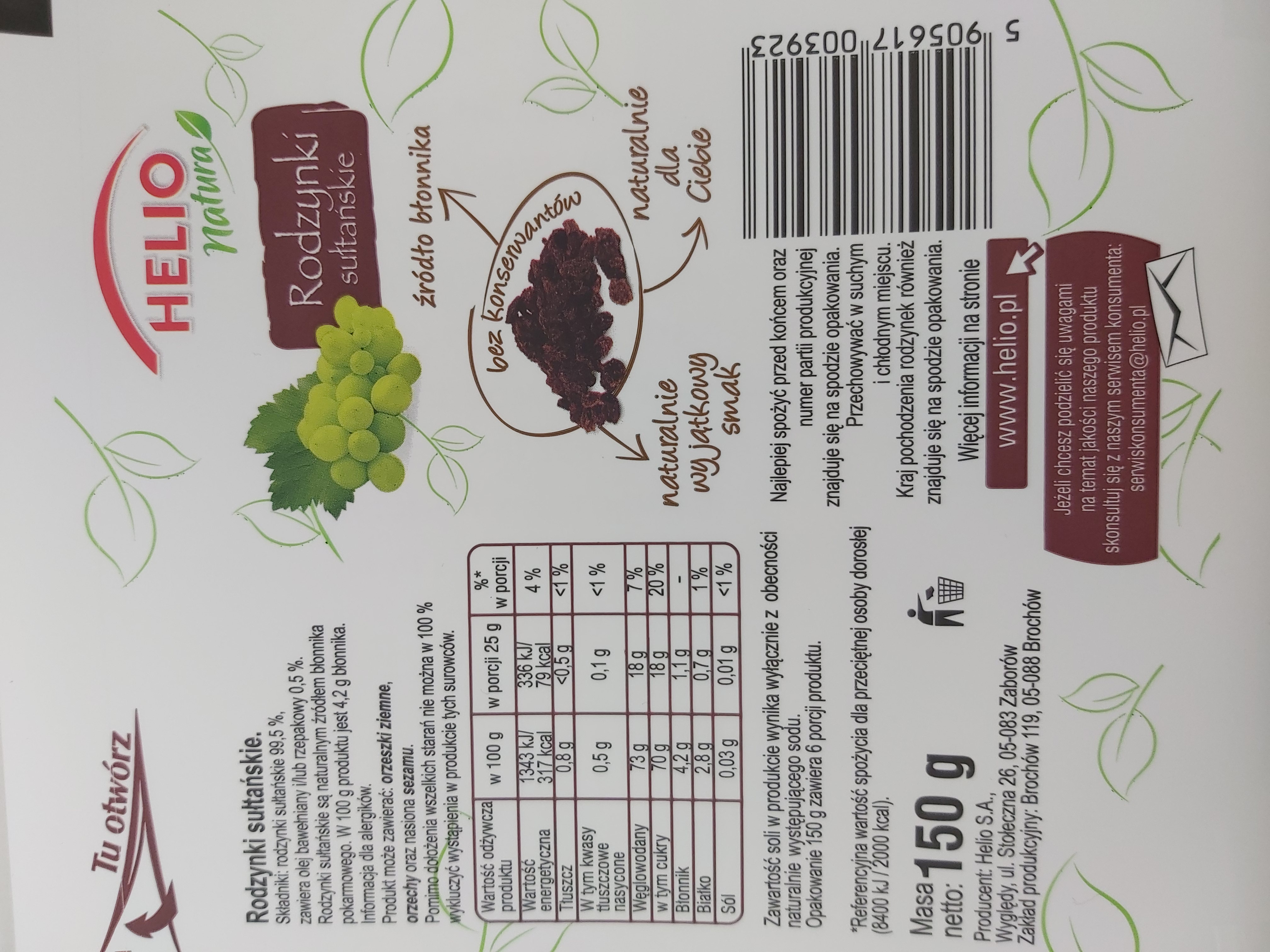 | Składniki | Rodzynki sułtańskie 99,5%, zawiera olej bawełniany i/lub rzepakowy 0,5 %. |