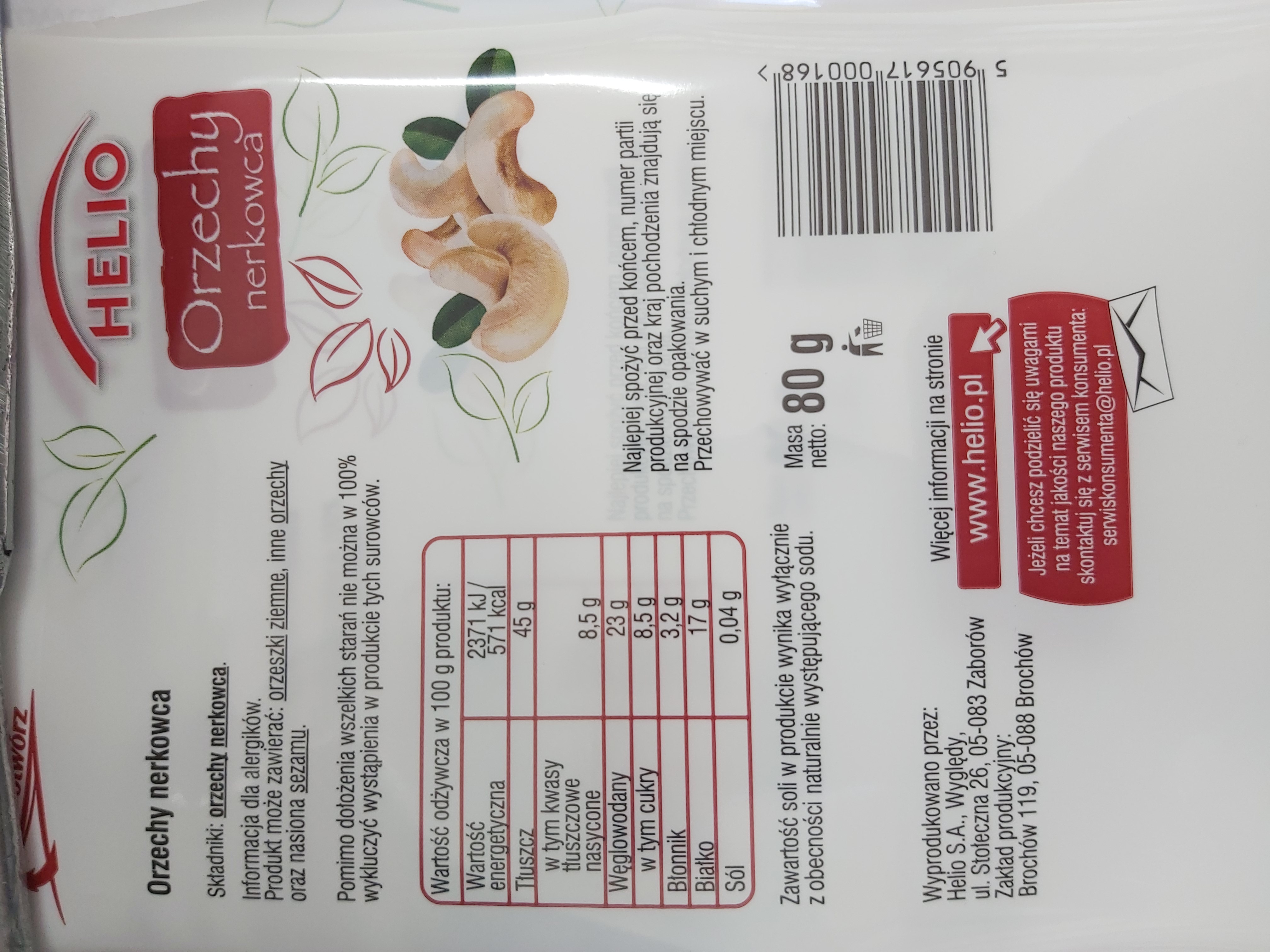 | Składniki | Orzechy nerkowca. Orzechy nerkowca mogą pochodzić również z Indii. |