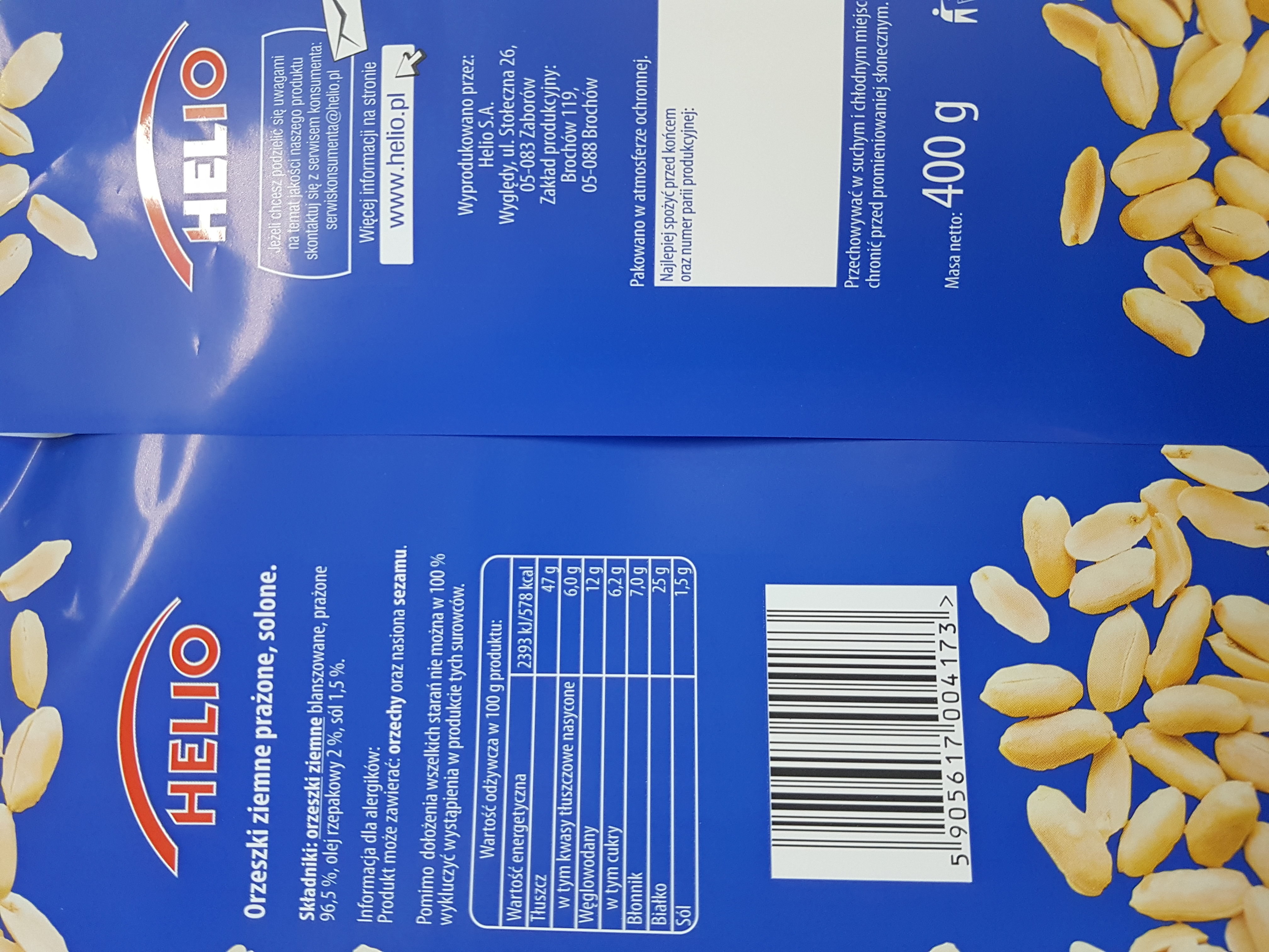 | Składniki | Orzeszki ziemne blanszowane, prażone 96,5%, olej rzepakowy 2 % sól 1,5 %. Orzeszki ziemne mogą pochodzić z Chin lub USA. |