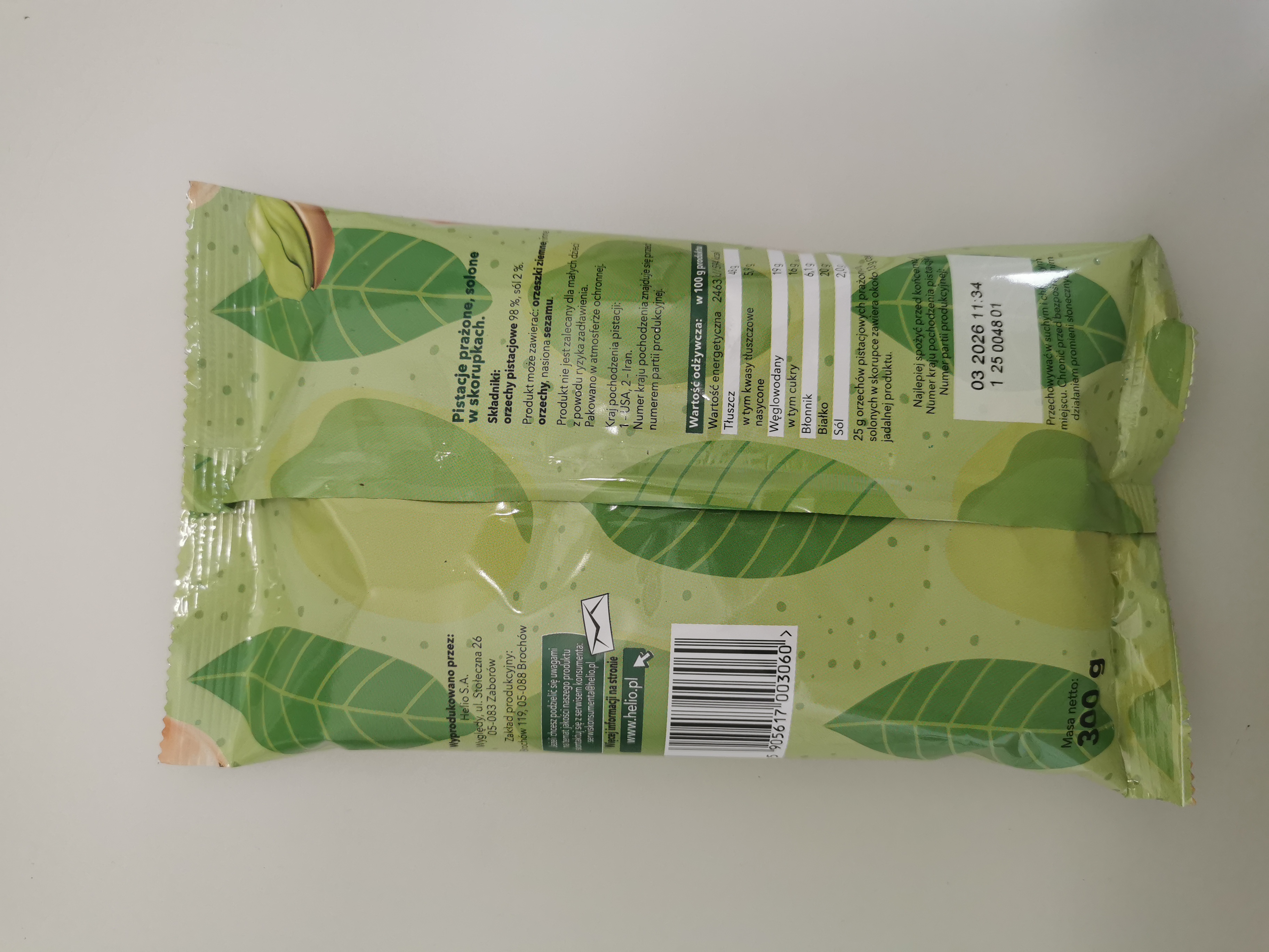 | Składniki | Orzechy pistacjowe w skorupkach 98%, sól 2%. |