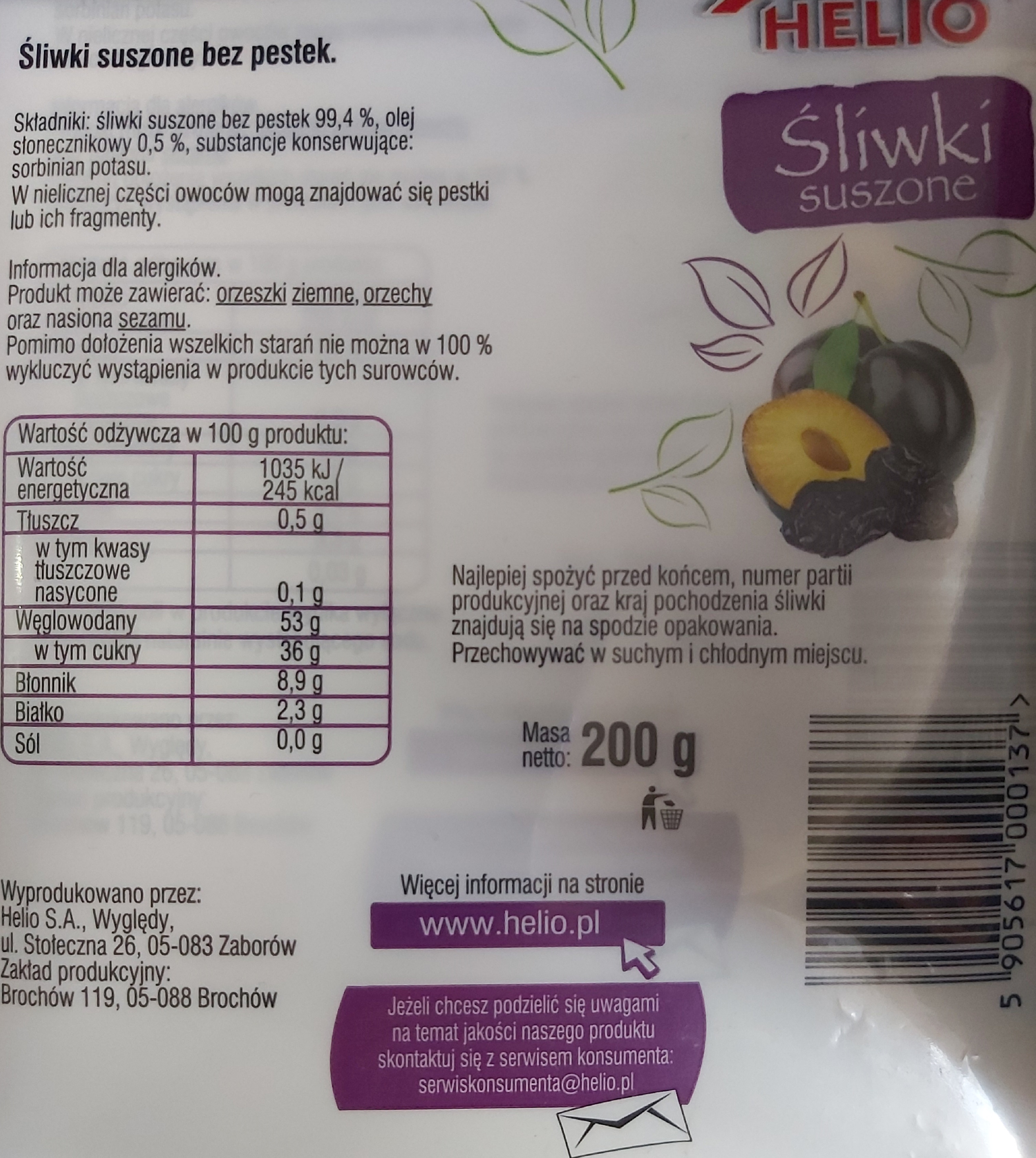 | Składniki | Śliwki suszone bez pestek 99,4%, olej słonecznikowy 0,5 %, substancja konserwująca: sorbinian potasu. |