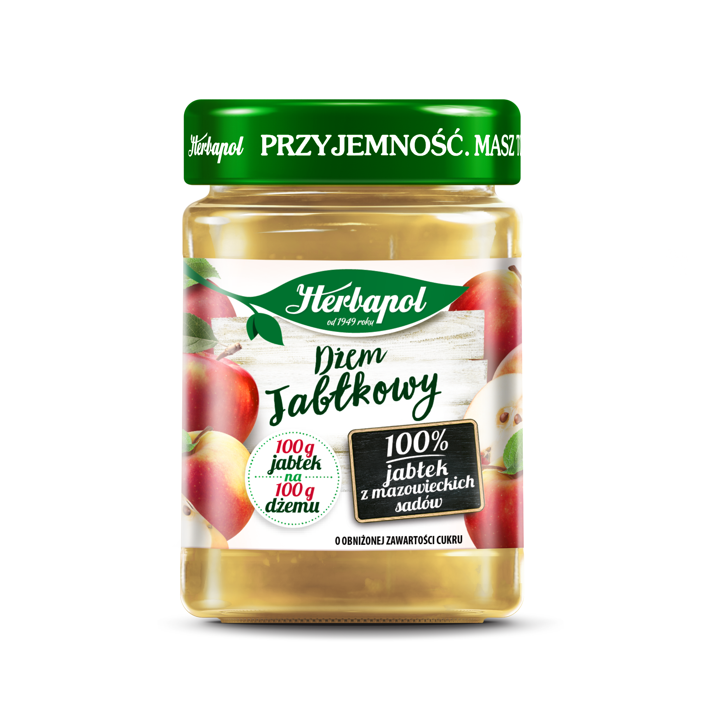 Dżem 100% jabłek z mazowieckich sadów - 100g owocu na 100g dżemu - o obniżonej zawartości cukru, idealny do naleśników, ciast i deserów.
