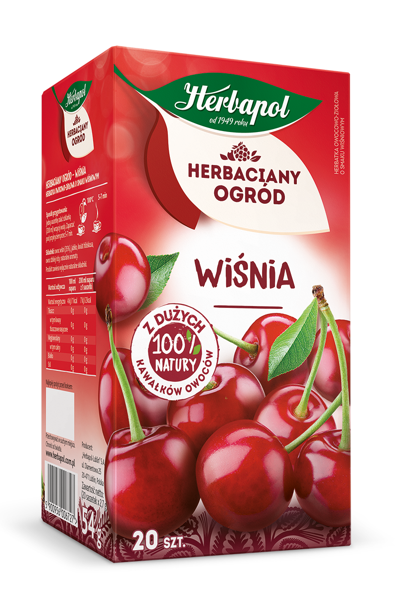 Wiśnia to herbatka, której mocno owocowy smak pochodzi wyłącznie z składników. Przez przezroczystą saszetkę możesz zobaczyć duże kawałki owoców, dzięki którym napój jest wyjątkowo smaczny i aromatyczny. Sięgając po Herbaciany Ogród wybierasz to, co najlepsze z natury.