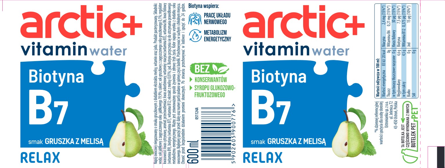 Arctic+ woda witaminowa o smaku gruszki z melisą to doskonały napój uzupełniający Twoją codzienną dietę w witaminy B6, niacynę, biotynę, kwas foliowy i witaminę B12.