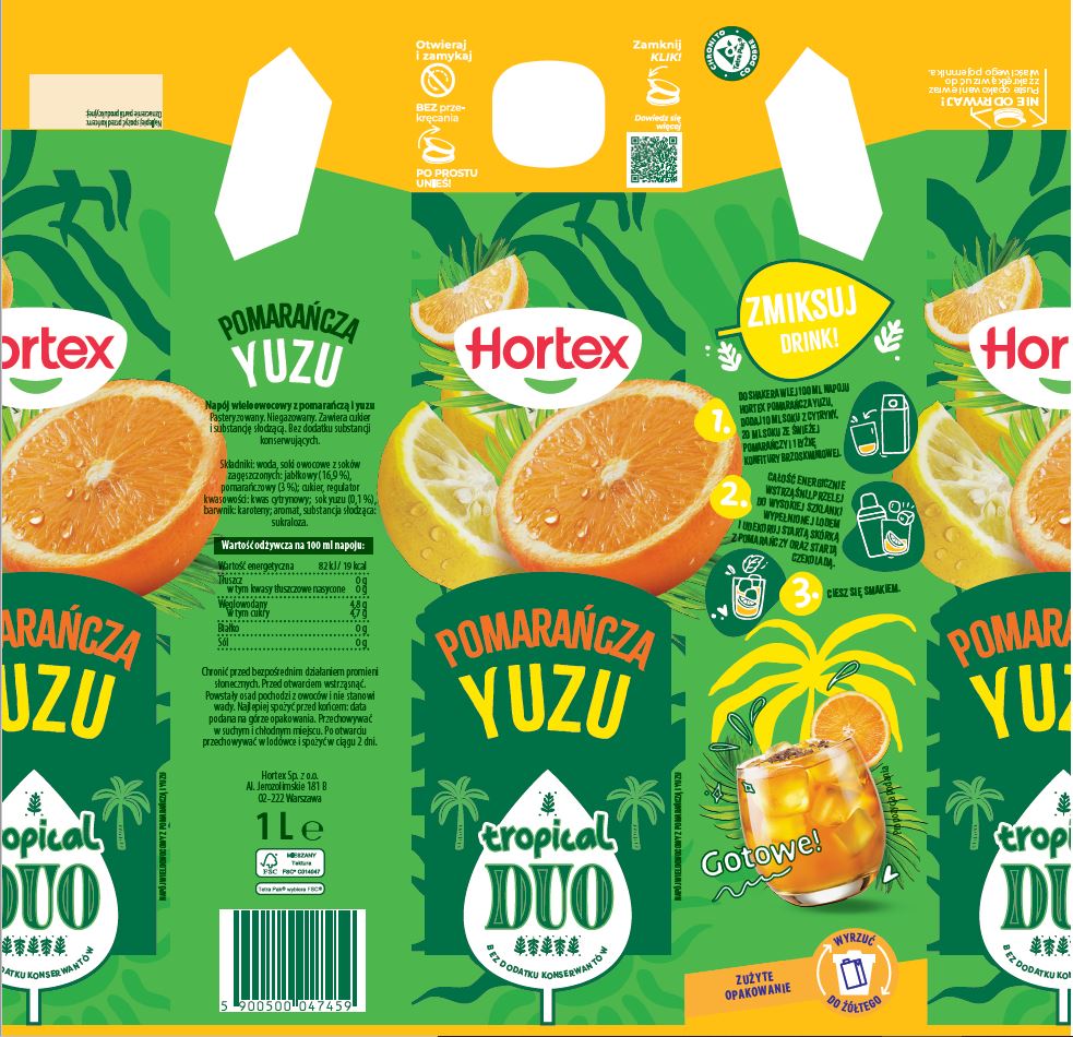 | Składniki | Woda, soki owocowe z soków zagęszczonych: jabłkowy (16,9%), pomarańczowy (3%); cukier, regulator kwasowości: kwas cytrynowy; sok yuzu (0,1%), barwnik: karotenowy; aromat, substancja słodząca: sukraloza. |