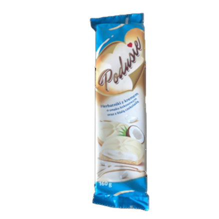 | Składniki | Podusie herbatniki z kremem o smaku kokosowym oraz białą czekoladą: krem o smaku kokosowym 43% (cukier, tłuszcz roślinny palmowy, serwatka w proszku (z mleka), olej roślinny słonecznikowy, mleko w proszku odtłuszczone, laktoza (z mleka), emulgator: lecytyny (ze słonecznika); aromat), biała czekolada 23% ( cukier, tłuszcz kakaowy, mleko w proszku pełne, serwatka w proszku (z mleka), tłuszcz roślinny palmowy, laktoza (z mlek), emulgatory: lecytyny (z soi) i e 476; aromat), mąka pszenna, tłuszcz roślinny palmowy, cukier, skrobia ziemniaczana, kokos 1,1%, syrop cukru inwertowanego, aromat, substancja spulchniająca: węglany amonu; sól, barwnik: annato. wartość odżywcza w 100 g: wartość energetyczna 2172 kj / 520 kcal, tłuszcze 29 g (w tym kwasy tłuszczowe nasycone 13,1 g), węglowodany 59,8 g (w tym cukry 44,2 g), białko 4,5 g, sól 0,24 g. wartość odżywcza w porcji 20 g: wartość energetyczna 434 kj / 104 kcal, tłuszcze 5,8 g (w tym kwasy tłuszczowe nasycone 2,6 g), węglowodany 12 g (w tym cukry 8,8 g), białko 0,9 g, sól 0,05 g. podusie herbatniki z kremem o smaku waniliowym oraz z czekoladą mleczną: krem o smaku waniliowym 43% (cukier, tłuszcz roślinny palmowy, serwatka w proszku (z mleka), olej roślinny słonecznikowy, mleko w proszku odtłuszczone, laktoza (z mleka), emulgator: lecytyny (ze słonecznika); aromat, sproszkowane laski wanilii 0,005%), czekolada mleczna 23% ( cukier, tłuszcz kakaowy, mleko w proszku pełne, miazga kakaowa, serwatka w proszku (z mleka), tłuszcz roślinny palmowy, emulgatory: lecytyny (z soi) i e 476; aromat), mąka pszenna, tłuszcz roślinny palmowy, cukier, skrobia ziemniaczana, syrop cukru inwertowanego, kakao o obniżonej zawartości tłuszczu, aromat, substancja spulchniająca: węglany amonu; sól. wartość odżywcza w 100 g: wartość energetyczna 2151 kj / 514 kcal, tłuszcze 28,2 g (w tym kwasy tłuszczowe nasycone 12,4 g), węglowodany 59,1 g (w tym cukry 41,9 g), białko 5,7 g, sól 0,26 g. wartość odżywcza w porcji 20 g: wartość energetyczna 430 kj / 103 kcal, tłuszcze 5,6 g (w tym kwasy tłuszczowe nasycone 2,5 g), węglowodany 11,8 g (w tym cukry 8,4 g), białko 1,1 g, sól 0,005 g. |