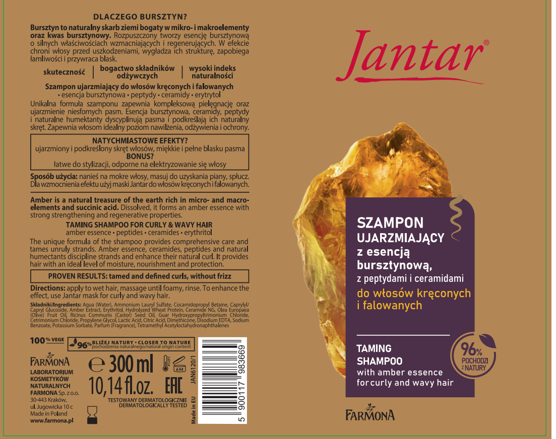 Jantar Szampon ujarzmiający do włosów kręconych i falowanych z esencją bursztynową, peptydami i ceramidami, 300 ml