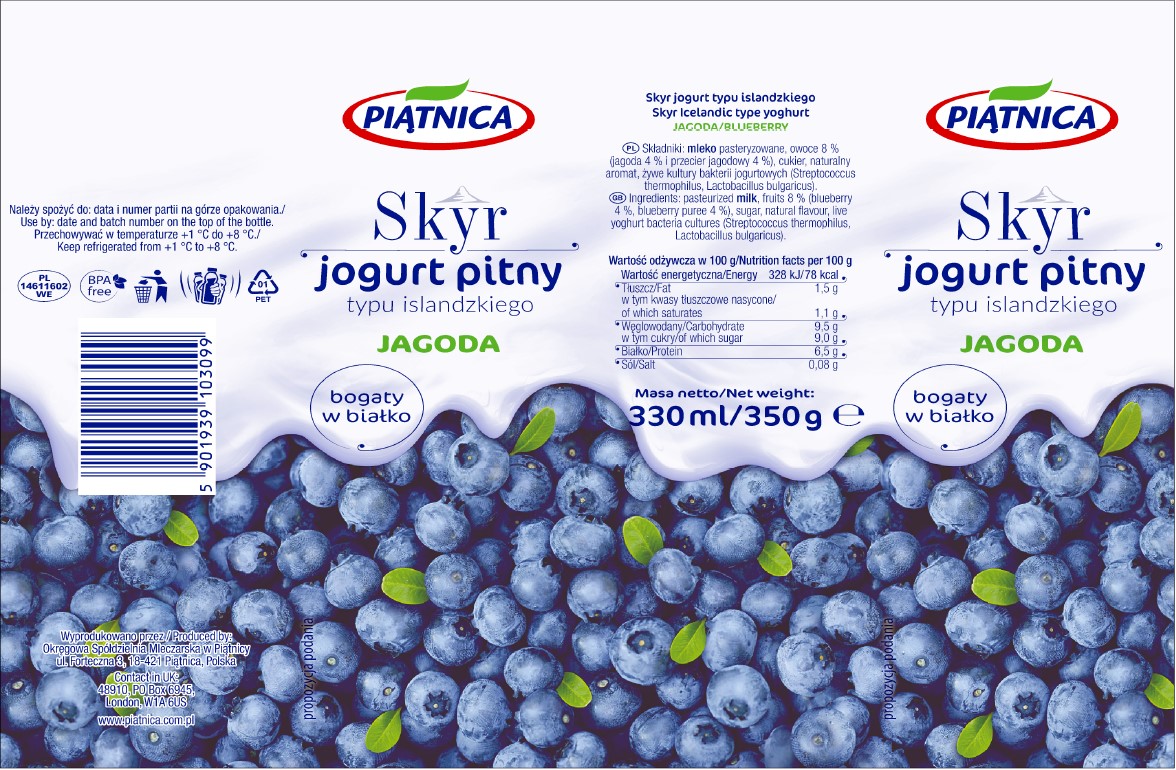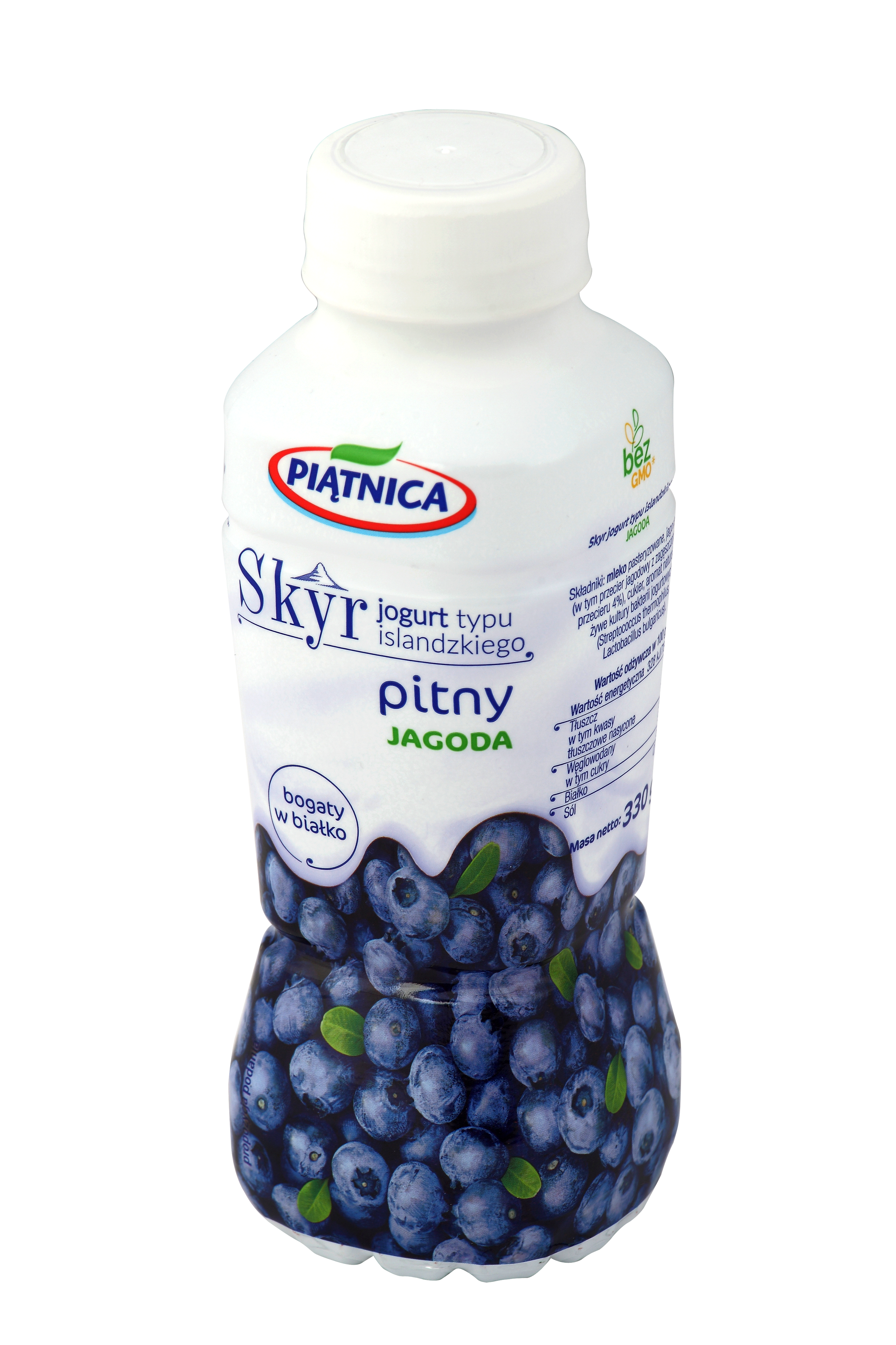 Skyr pitny jagodowy to pyszny, owocowy jogurt z wysoką zawartością białka - 6.5 g/100 g jogurtu. To doskonała przekąska dla osób prowadzących aktywny i zdrowy tryb życia. Idealnie wpisuje się w trend „on the go” oraz w coraz popularniejszy ma polskim rynku trend zdrowego żywienia i zdrowych przekąsek, zapewniających energię podczas aktywnego dnia. Produkowany jest z wysokiej jakości mleka od krów karmionych paszami bez GMO.